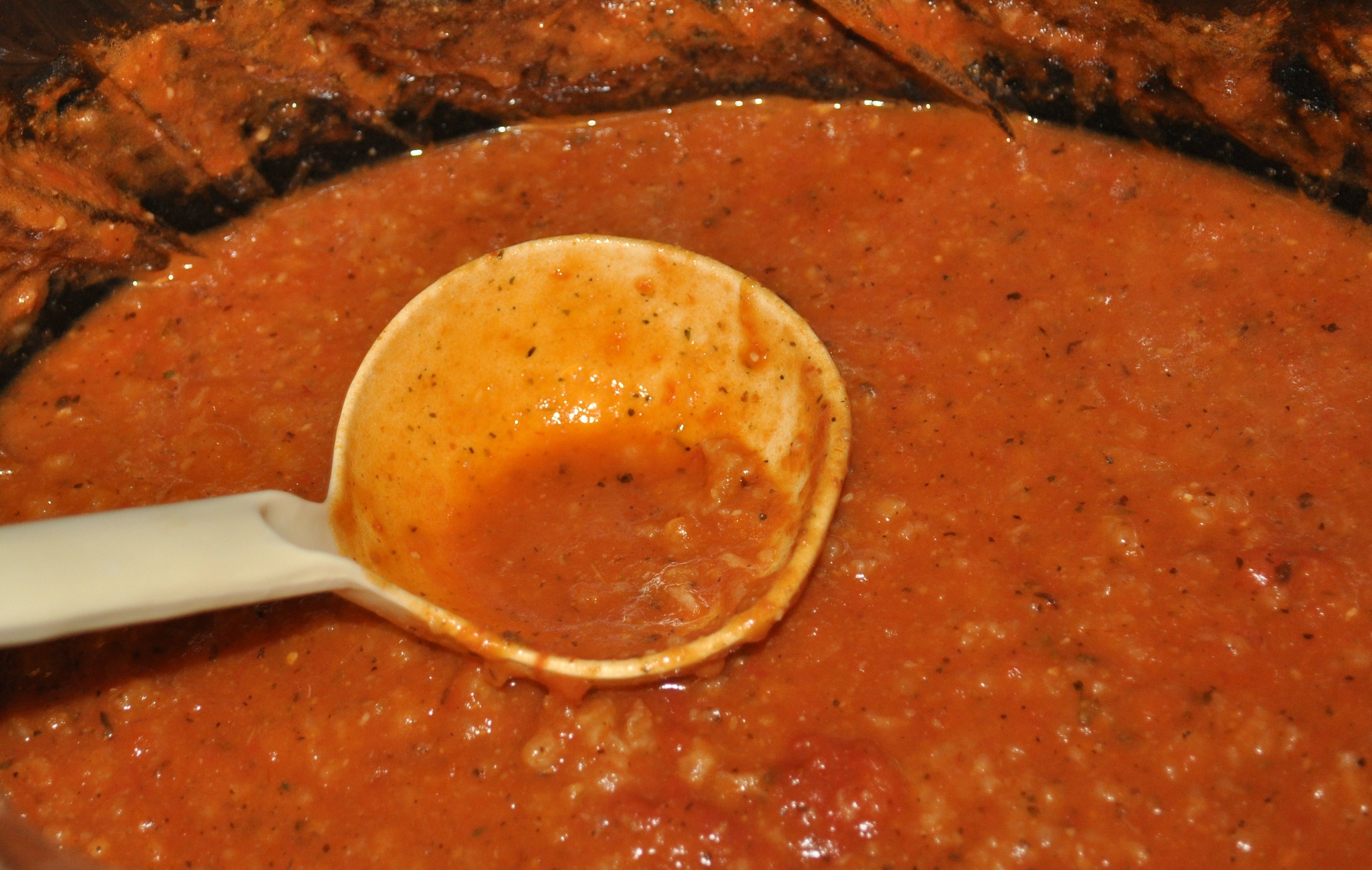 Tomato rice soup. Made with tomatoes I grew last summer. Amish paste tomatoes. About two pounds of them. Put in the crock pot with some chicken broth and almond milk. Two tablespoons of tomato paste. A couple of cubes of my garlic scape pesto. Allowed to cook all day, until about an hour before serving when I pureed the tomatoes and added a cup of riso.