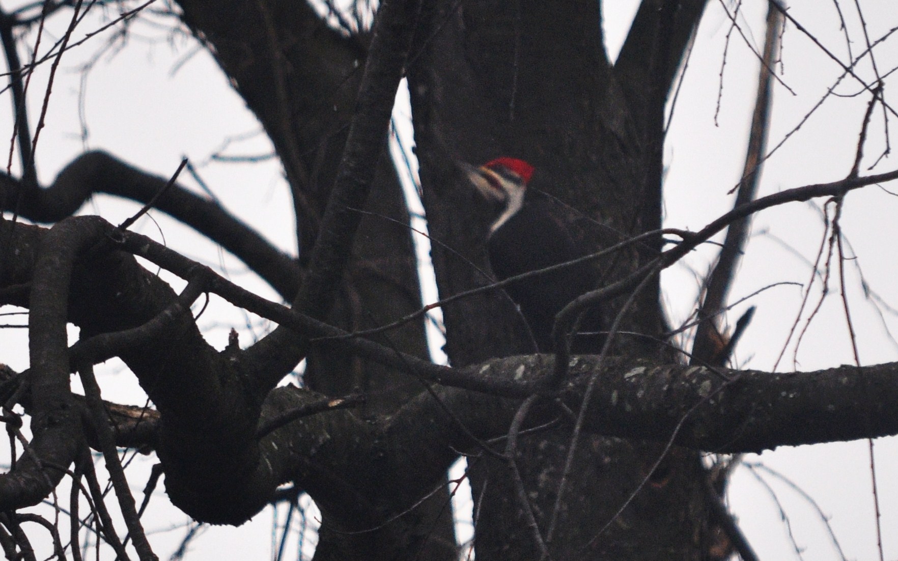 Finally!! I got a picture of the pileated woodpecker, at least one of them, that have been living at the edge of our property for the past two years. We hear them all the time. I saw one of them once a year ago. Today they came out and visited the side yard right out our window.
