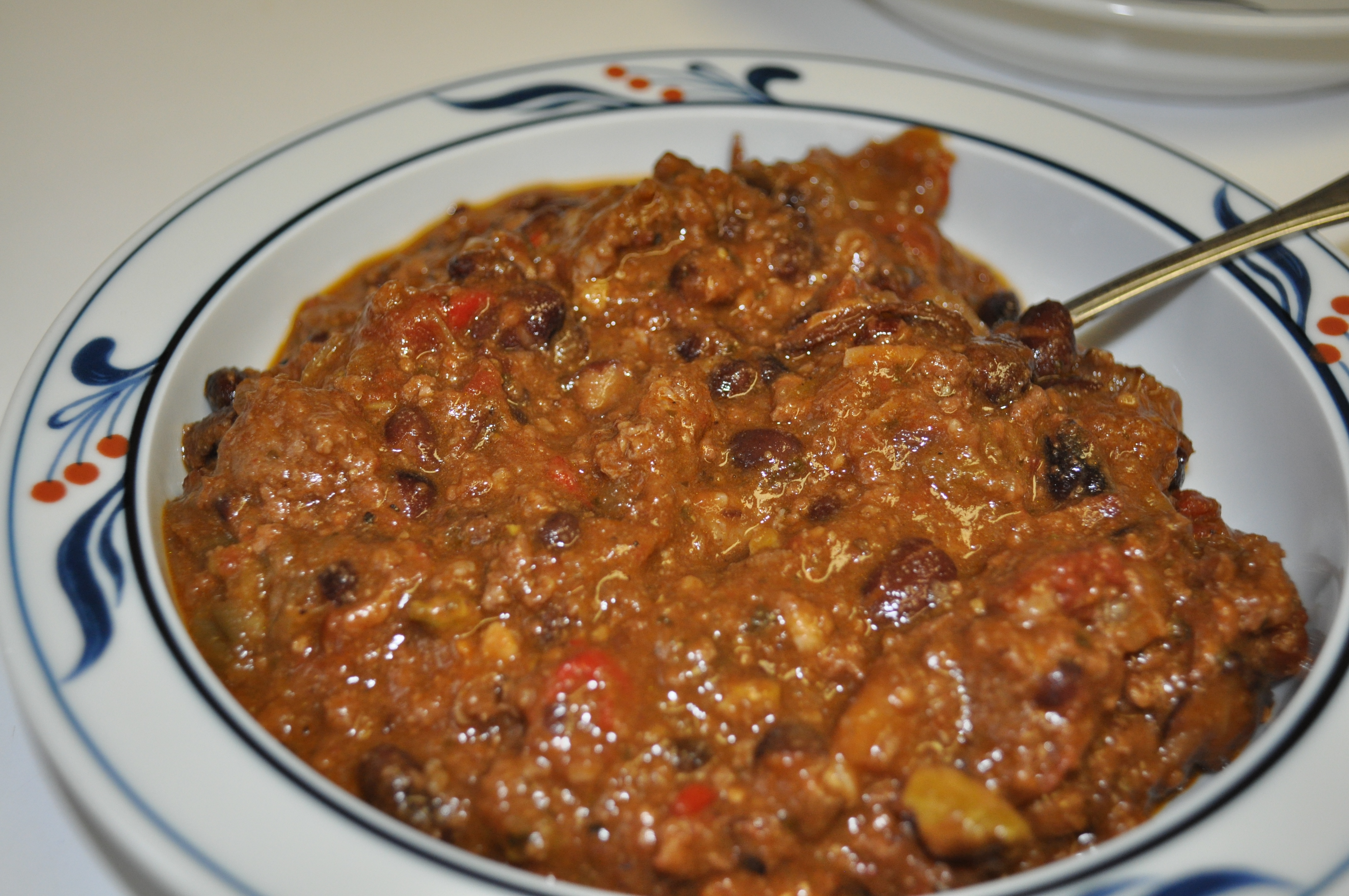 I will save more details about what we learned for a future post, and get back to the other topic, What was dinner? The vast majority of the chili came from our freezer. It included a large container of heirloom tomatoes from my garden, onions and peppers from the CSA, and a beef stew stock made last fall. All dumped in the crock pot with a pound of the ground venison. Additional tomato paste, black beans and tomato/lime/cilantro mix (courtesy of Rotel) came from the pantry and weren’t local. Also, a couple of onions from last week’s CSA delivery, chopped up. The spices were cinnamon, chili powder, garlic powder, salt and pepper. A splash of Pennsylvania maple syrup, and a chopped up jalapeno out of the freezer, another CSA contribution. Slow cooked for ten hours in the crock pot. It looked like this when done.