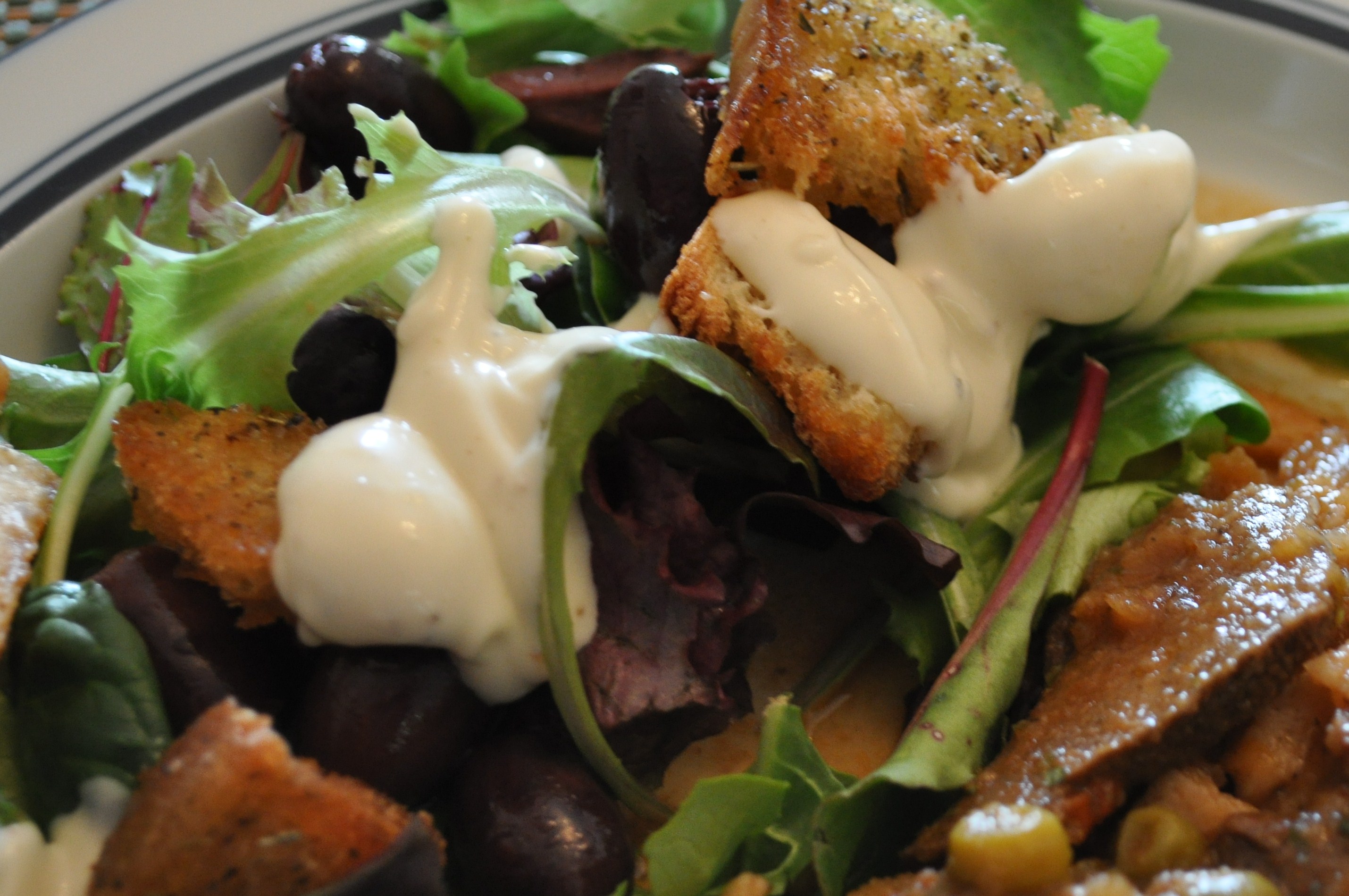 It came out tender and juicy and full of flavor. Paired with it was a very simple salad. I made the croutons Saturday morning with the last of the Great Harvest old fashioned white bread. The greens were CSA greens. Olives from Wegmans. Dressing from Roots. Neither of those were local. Still, this salad is so satisfying. Almost stole the show from the venison but not quite.