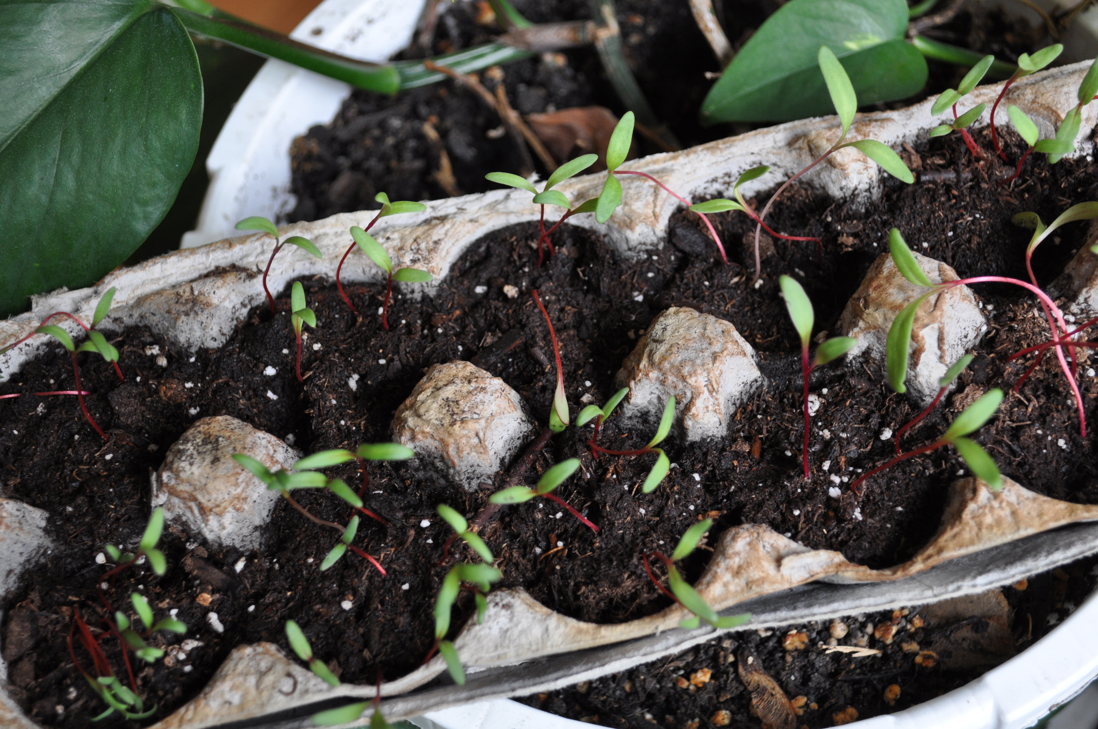 Starting ruby chard in an egg carton. These will get transplanted all sorts of places, to see where they do the best. Chard is so beautiful, you can use it as an accent plant, and then have it for dinner.
