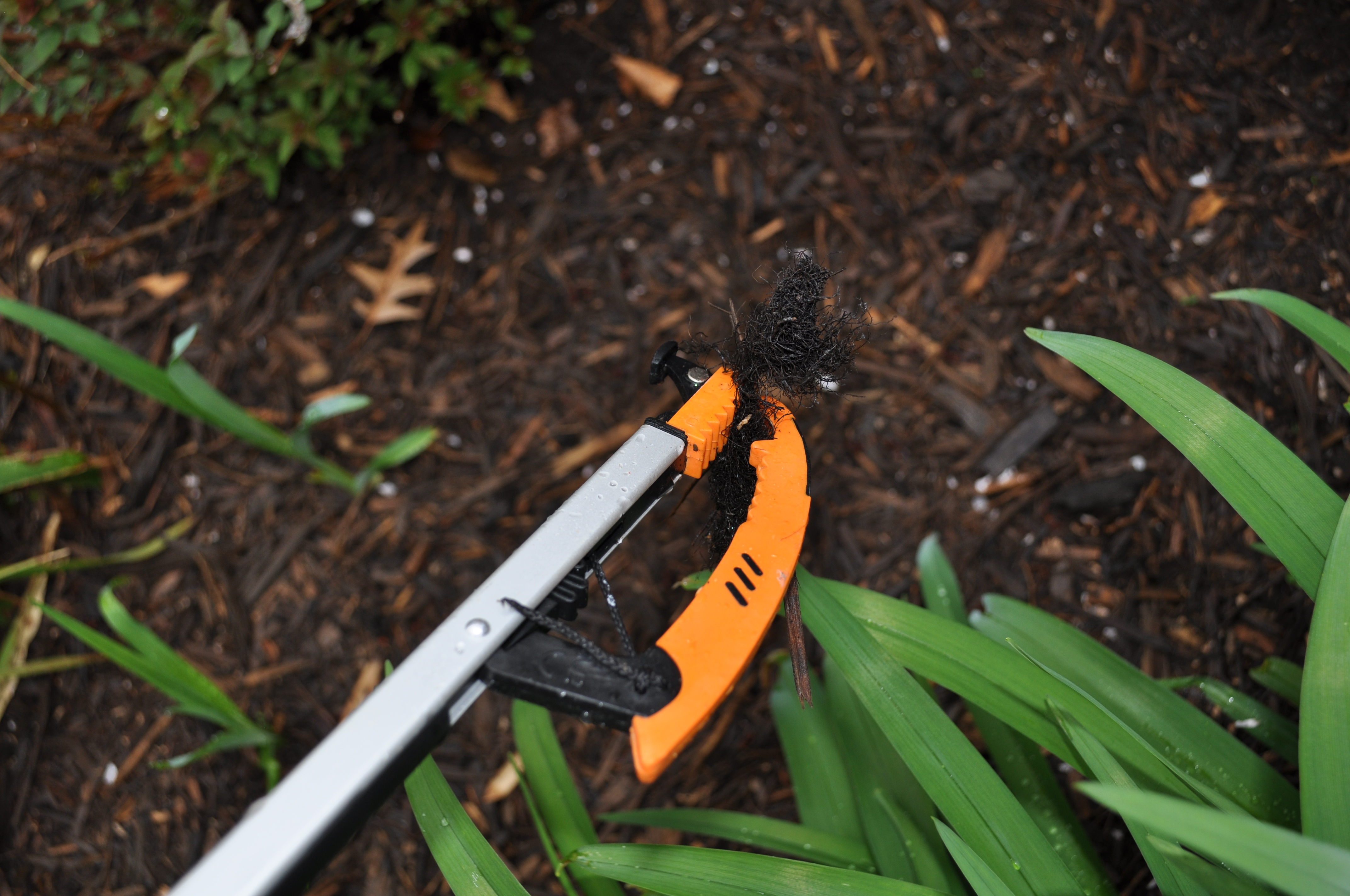 After I finished on the property line, I did a perimeter sweep of our mulched beds and picked up whatever blew into them from the road. We get lots of debris on recycling days.