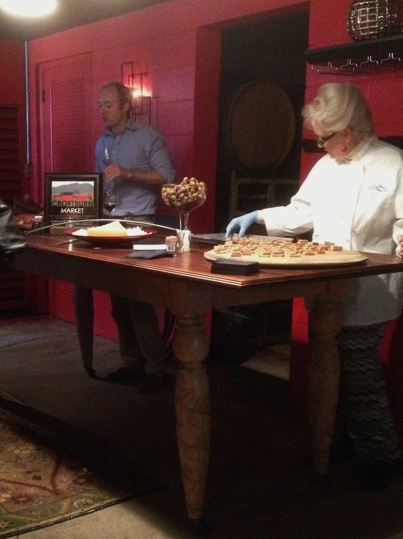 In the middle of the three wine stations, Margaret was set up with a charcuterie, olives and liver pate on toast. She did all the catering this year. This, along with her incredible decorating skills in the winery, inspire us to say (in my old Navy terms) Bravo Zulu! for accomplishing such a transformation in the winery, and for the wonderful food today.