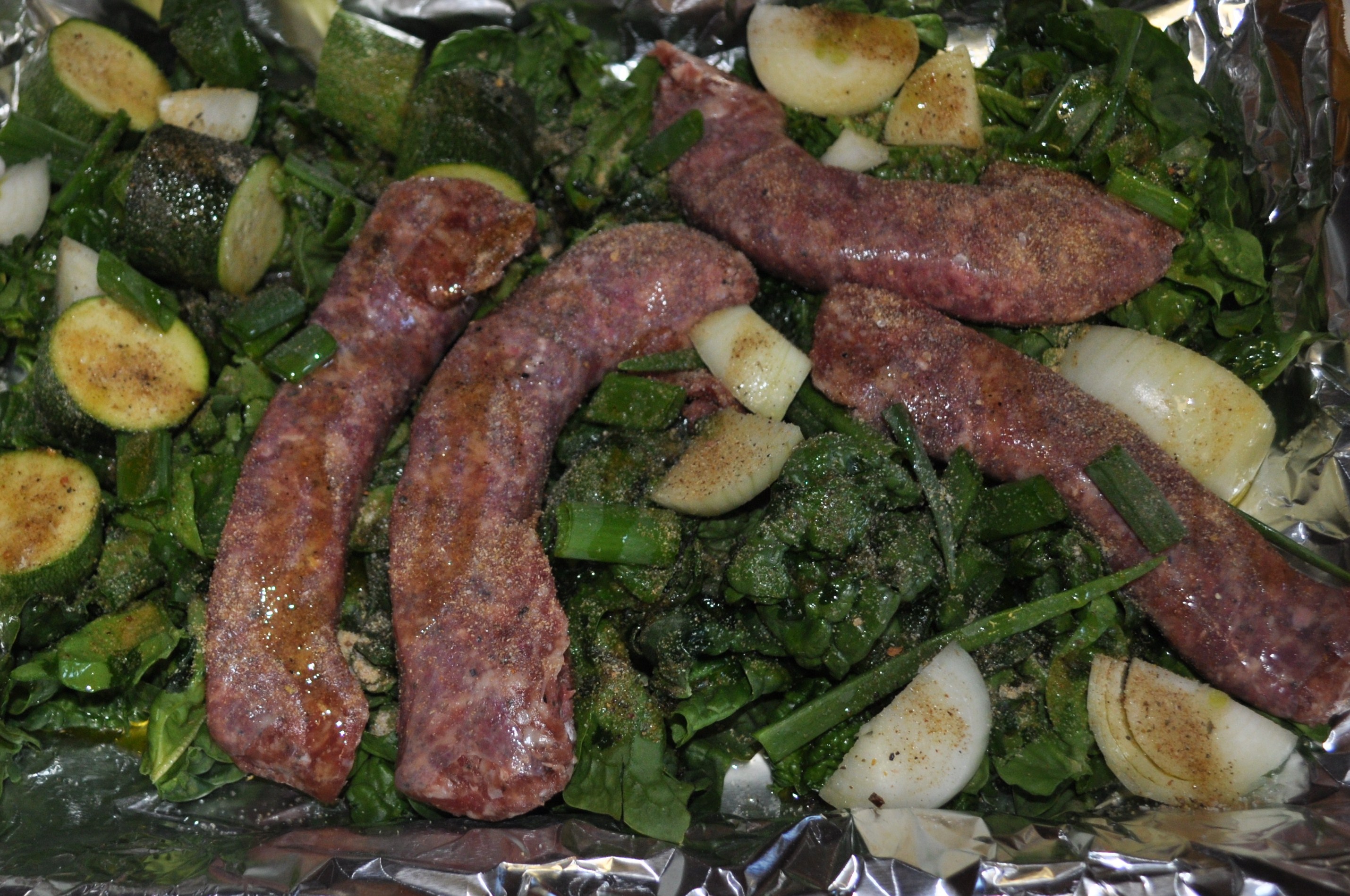 Italian sausage, spinach, onion, zucchini, garlic, spring onions, seasoned salt, olive oil, chicken broth. Slow cooked in the oven. Served for dinner with the Great Harvest bread to mop up all that lovely sauce.