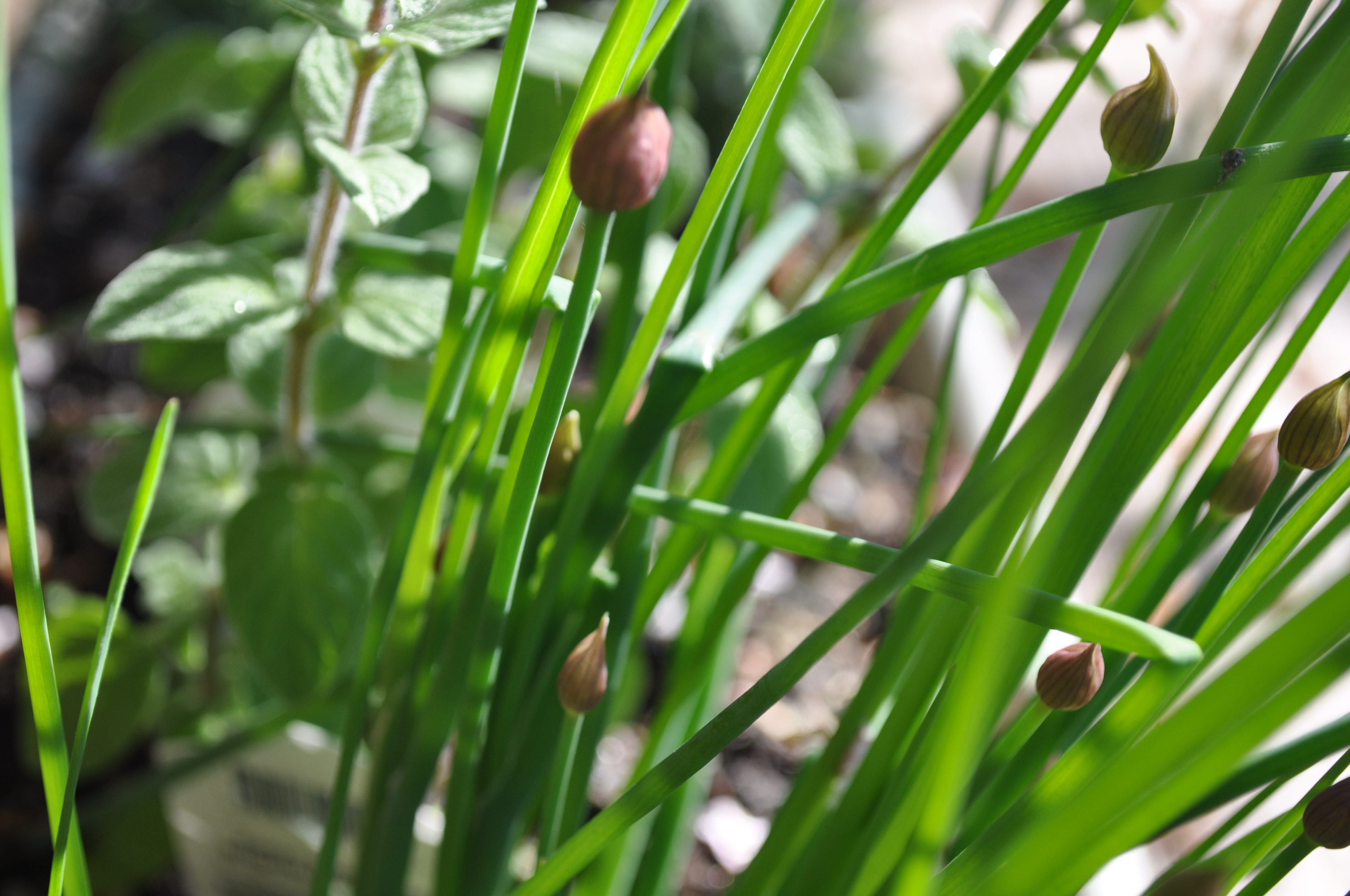Two kinds of sage in the herb garden. Then, I checked out the chives. They are getting ready to blossom.