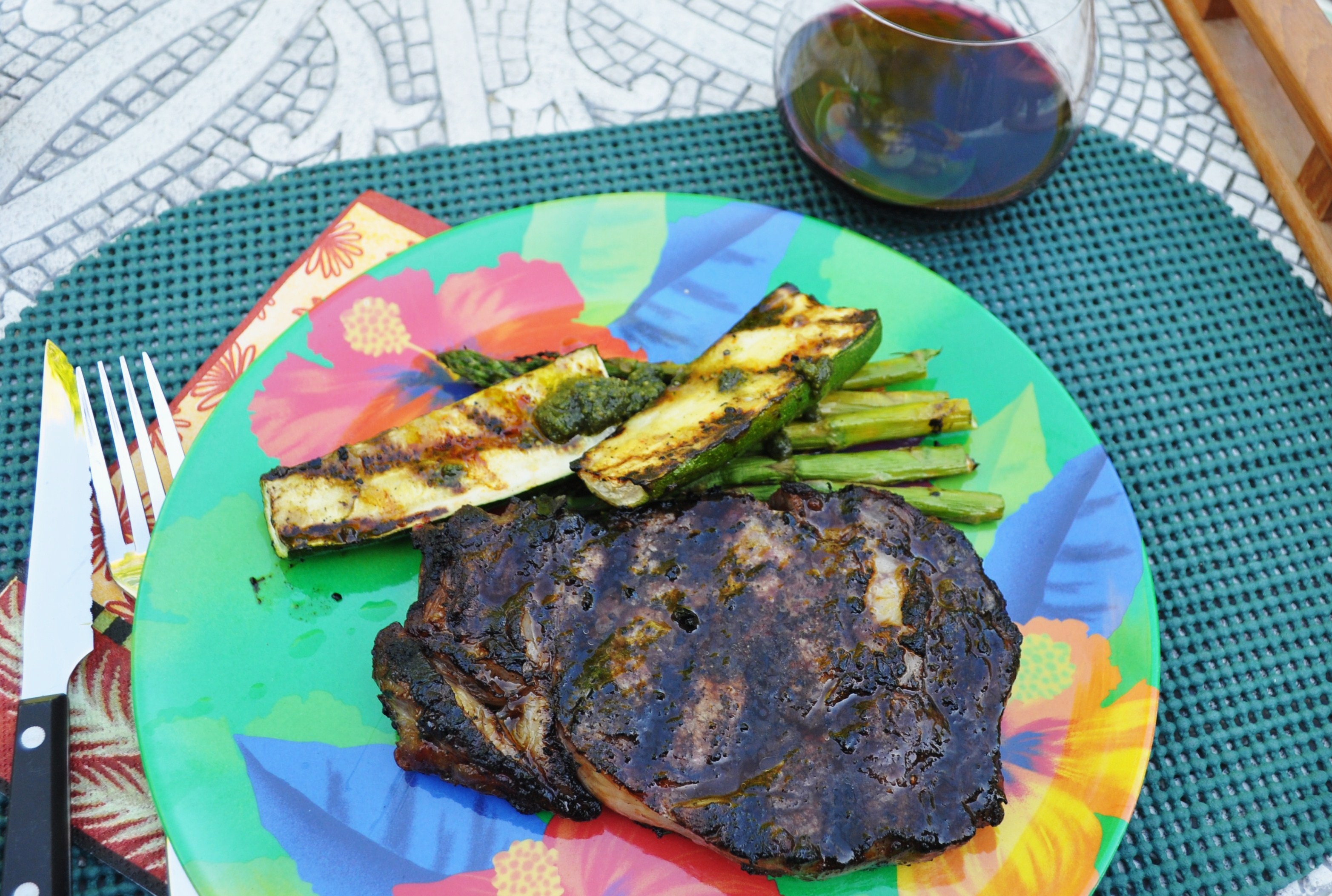 A couple of the TLV farm ribeyes on the grill with a side of asparagus and zucchini. My pesto from the freezer. A Breaux cellar selection syrah.