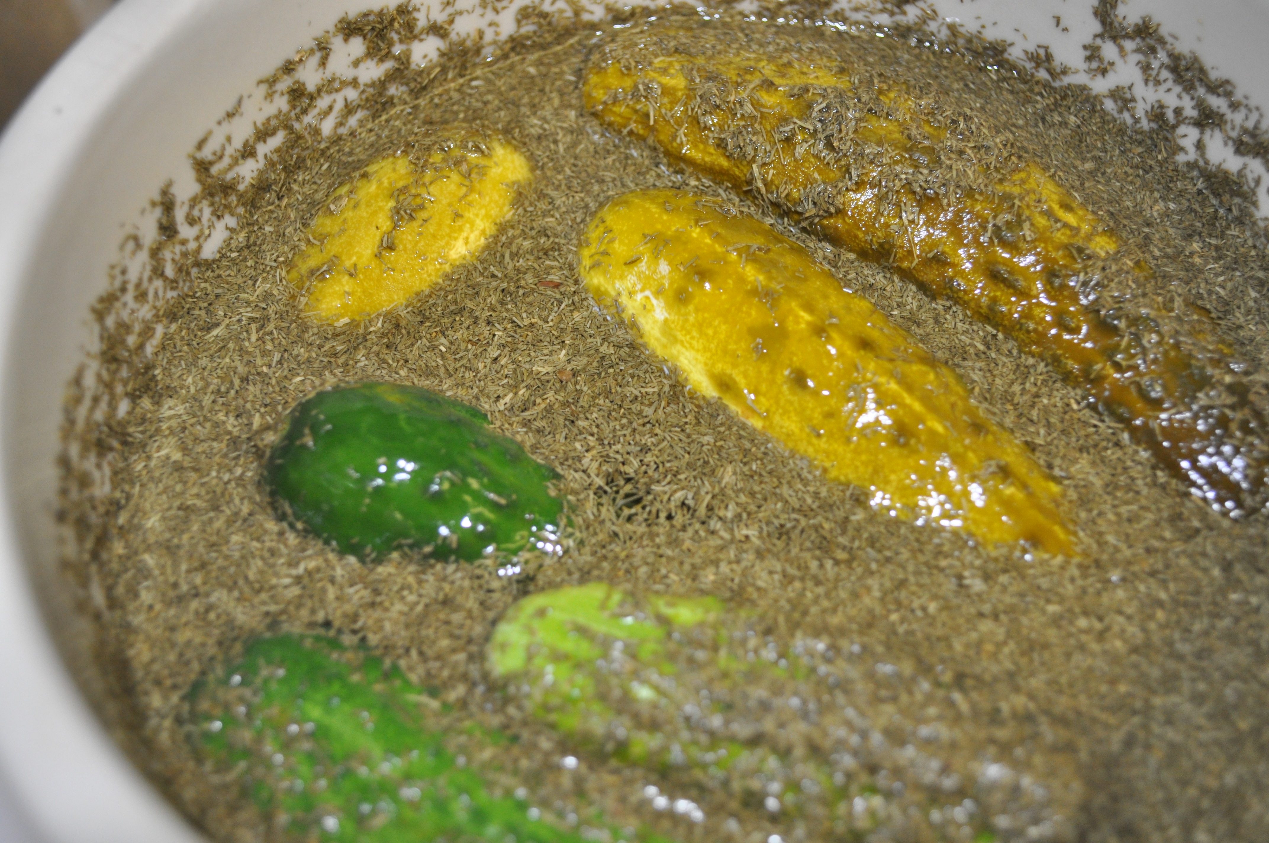 The pickles from a little over a week ago are ready to eat. My husband has already been going in the crock and grabbing one to have with lunch. The dark green new ones, scrubbed and dropped into the dill vinegar mix, will soak up that mouth puckering mixture that a perfect dill can achieve. To give them the crunch, I take a few out and put them in the fridge for a few hours before eating them.