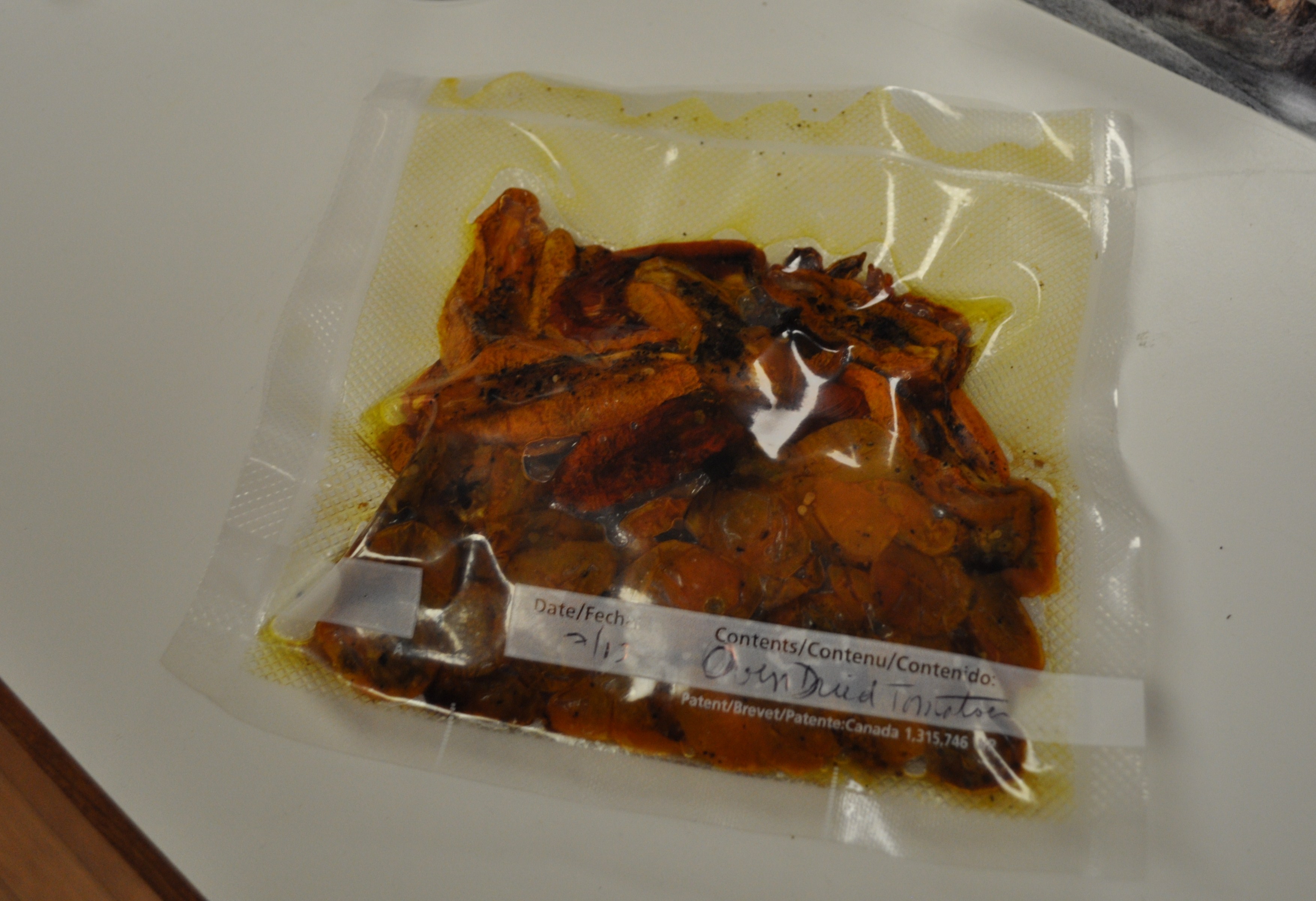 I oven dry tomatoes after slow roasting them at 250 degrees for two or so hours. They were liberally sprinkled with pepper, dusted with salt and sugar, and tossed in olive oil before roasting.