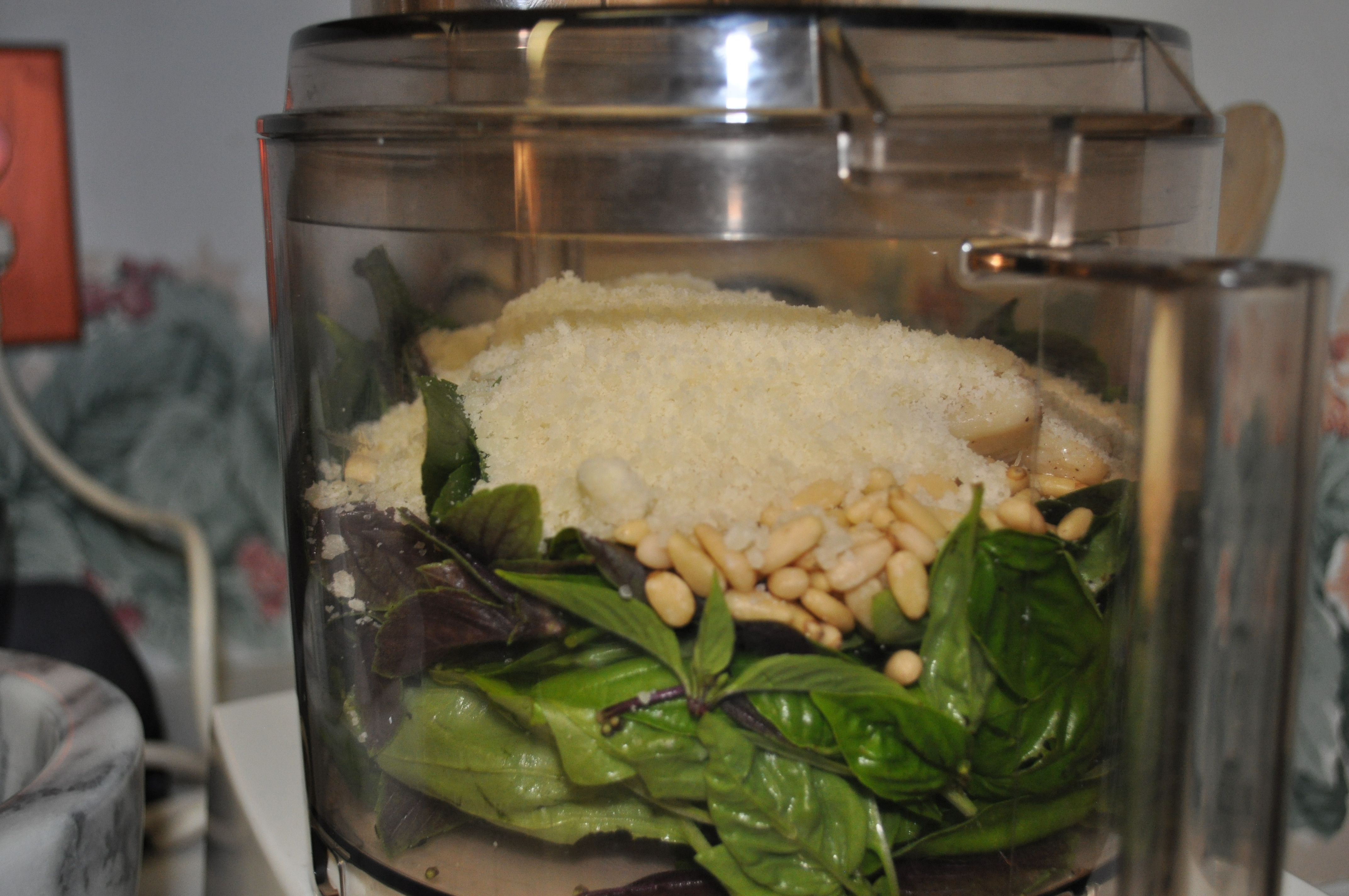 The three cups of basil, cup of pine nuts, cup of cheese (I used Pecorino this time), six cloves of roasted garlic, all went into the food processor.