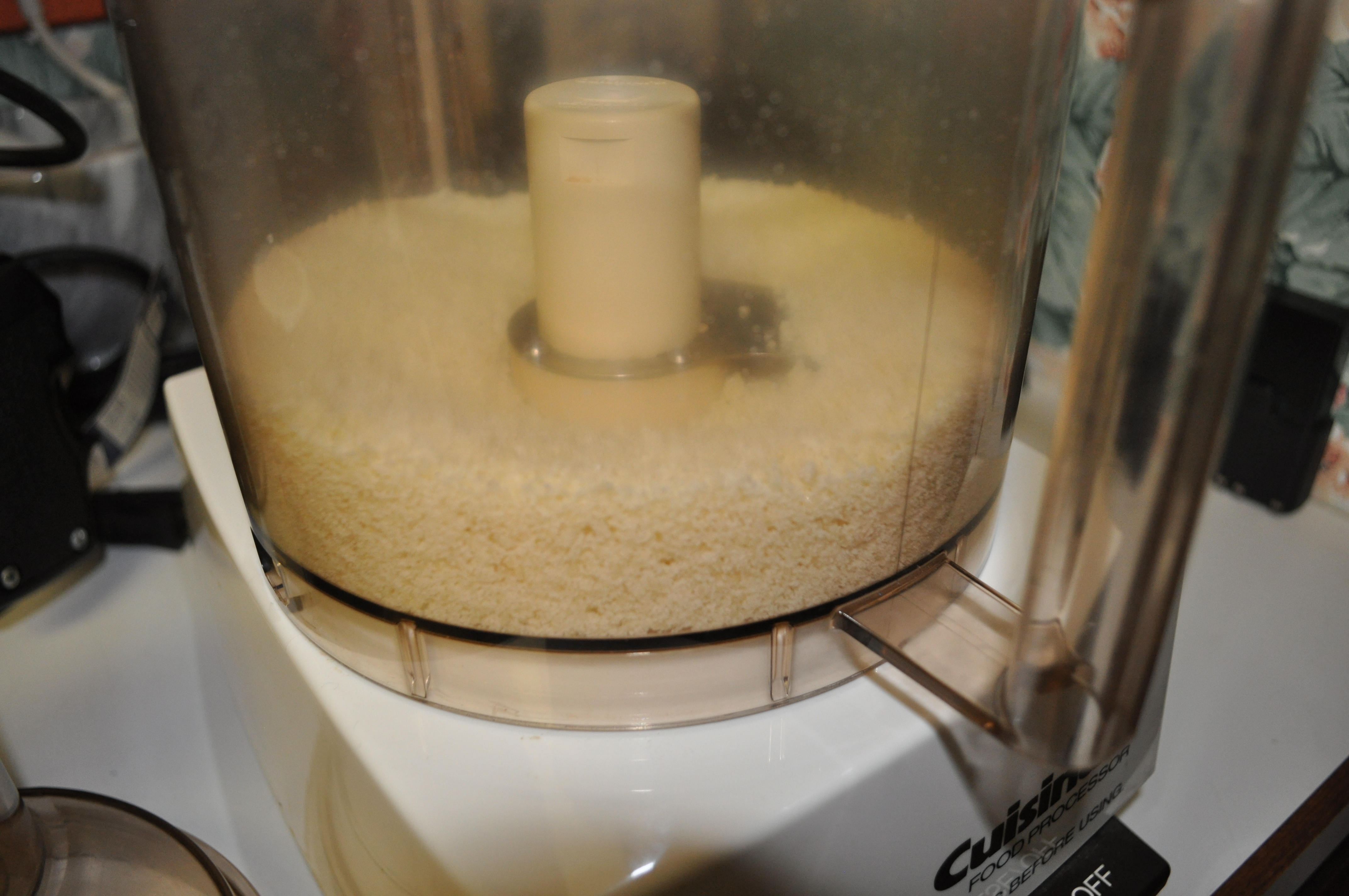 Start with a few hunks of pecorino romano and/or Parmigiano Reggiano. Process it until the food processor stops migrating across the counter top.