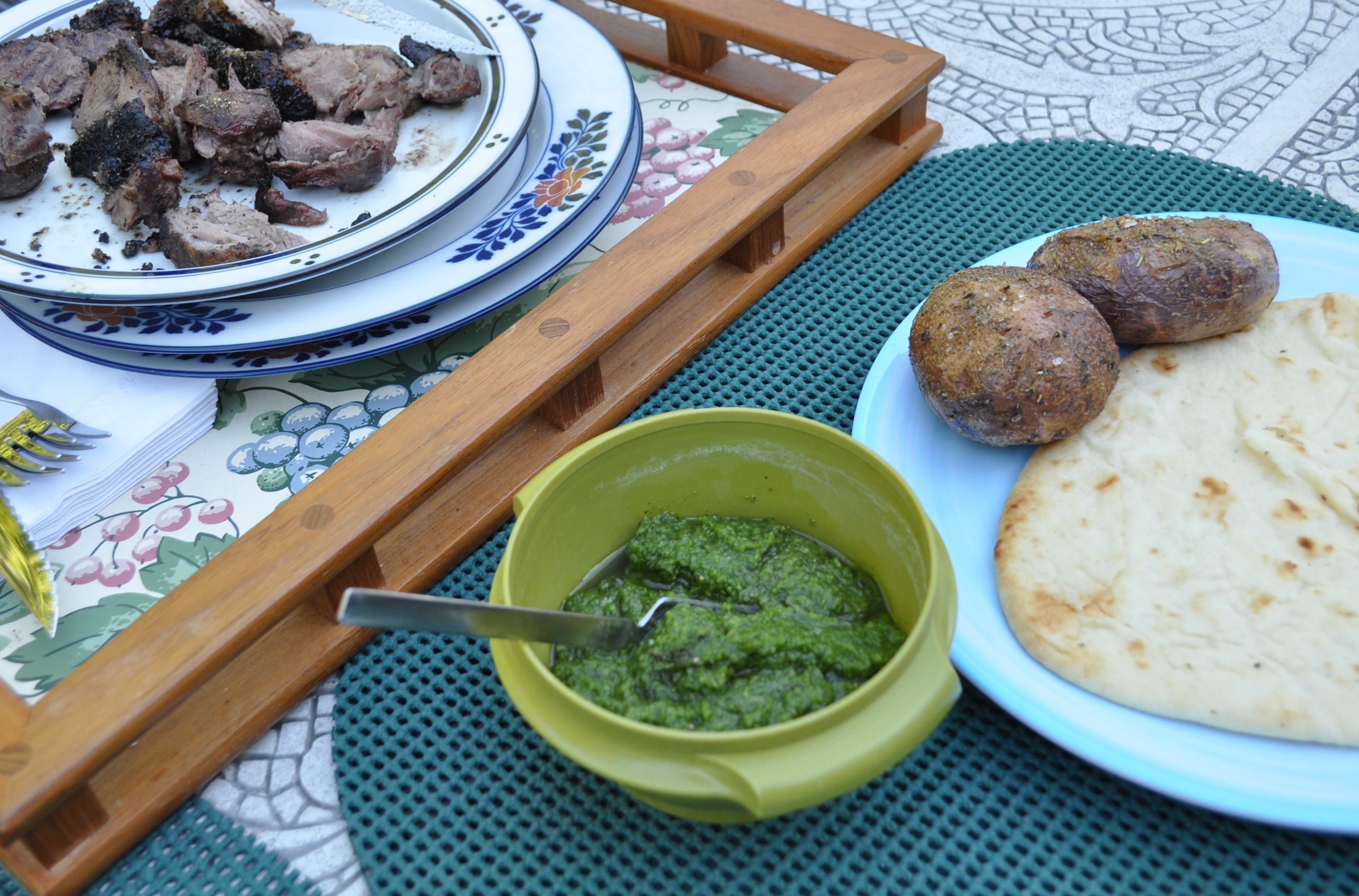 We grilled a foreshank roast. Added some CSA potatoes. Pesto made with sorrel, parsley, pine nuts and Parmesan.