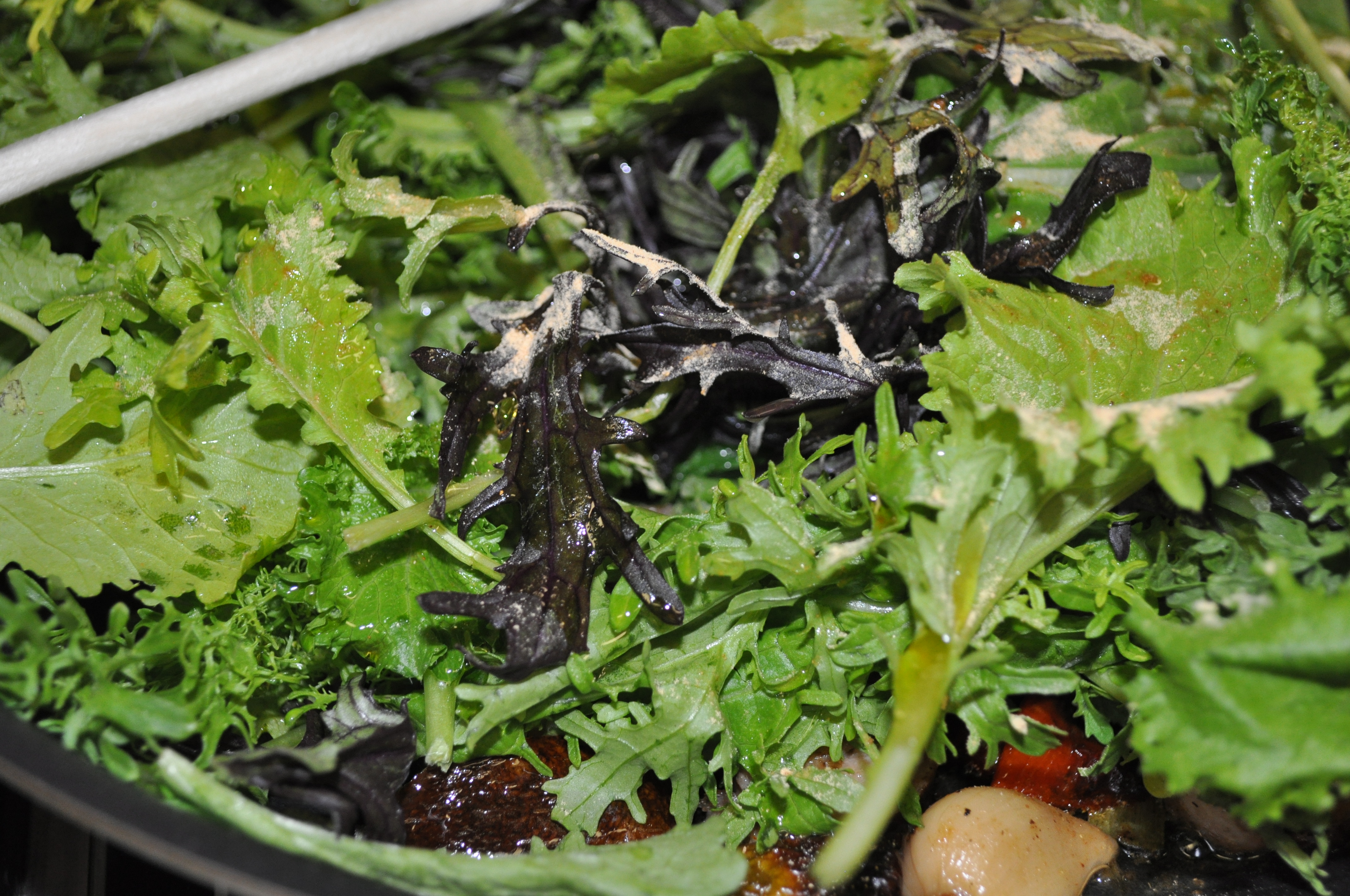 CSA veggies to the rescue. I had leftover spaghetti squash, chicken from Harris Teeter, and it was simple to cook up a mess of mustard greens. Like ten minutes simple.