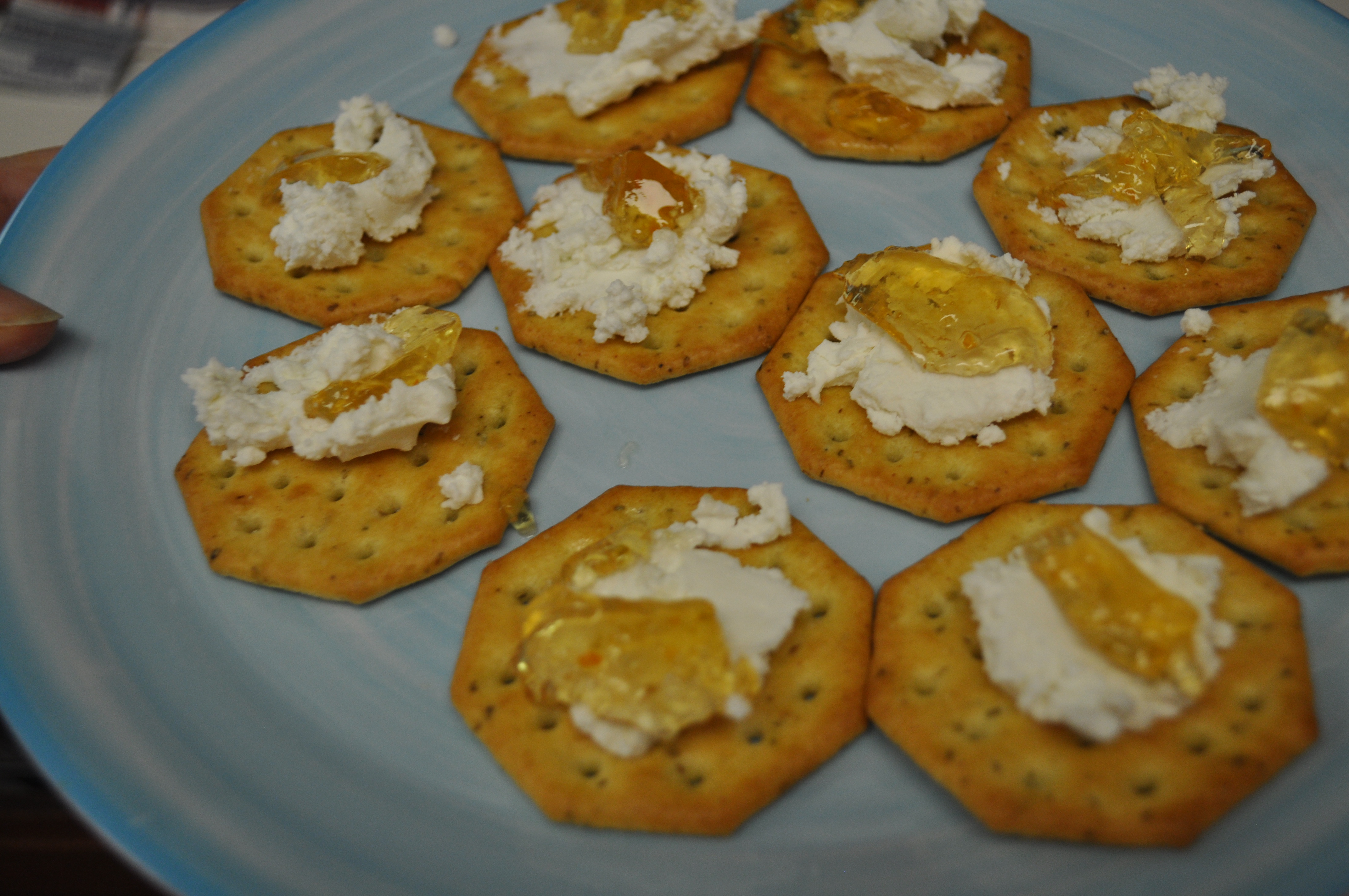 Crackers with chevre and pineapple habanero jelly. Don’t you always serve these at your football tailgate parties? If not, you should.