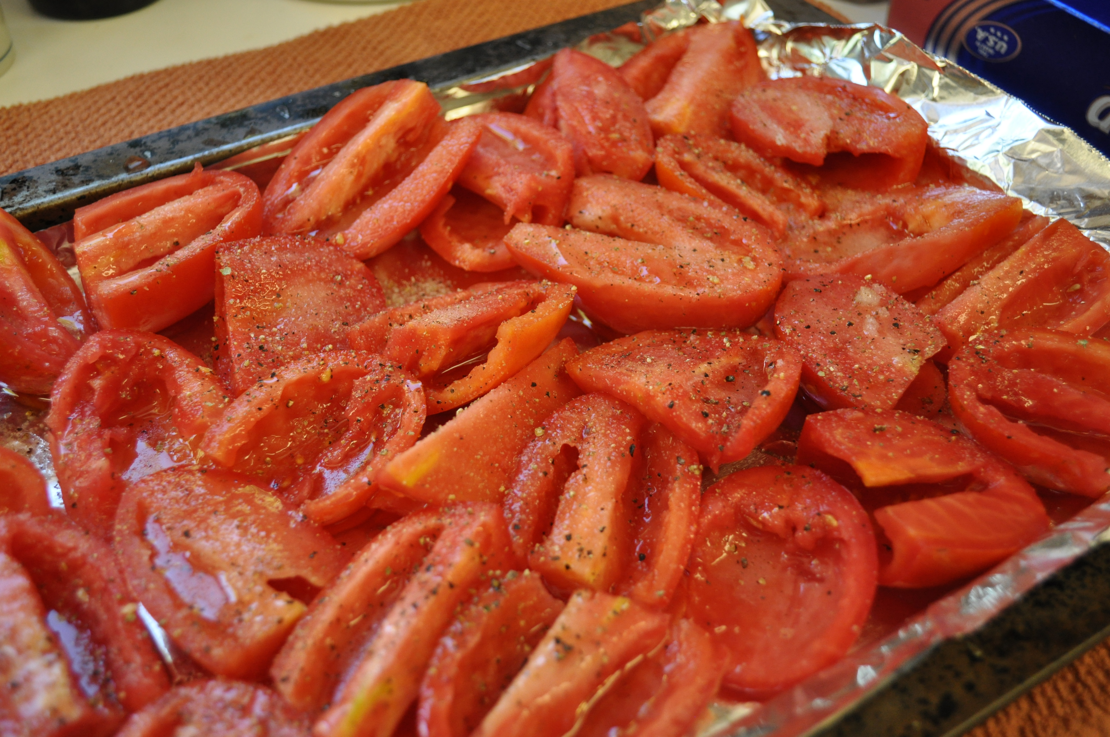 As for the tomatoes, I took a large amount of ripe ones and oven roasted them.
