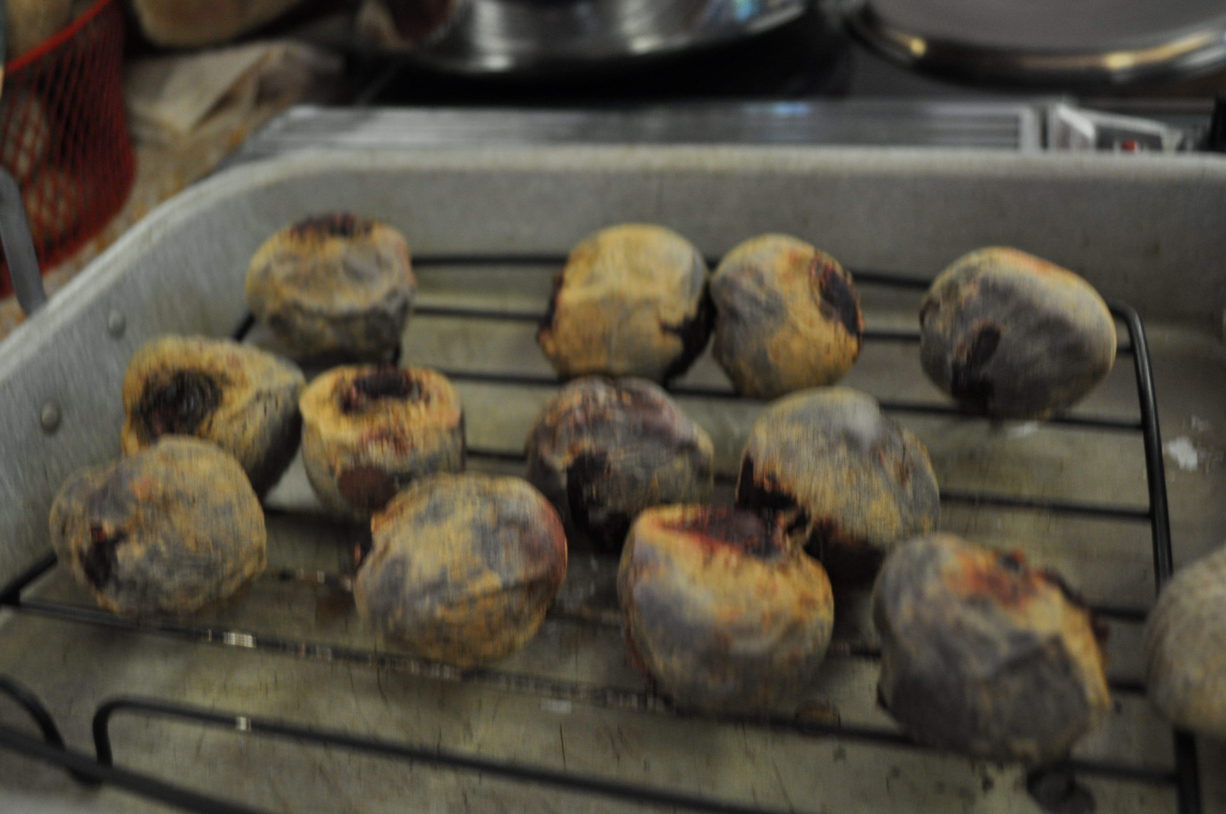 Out of the oven, and cooling, before being peeled. While they were cooling, I cooked a mix of cider and white vinegars, with a tablespoon of pickling spices, a teaspoon of salt, a teaspoon of sugar, and a handful of onions and other veggies (some from the Harris Teeter olive bar).