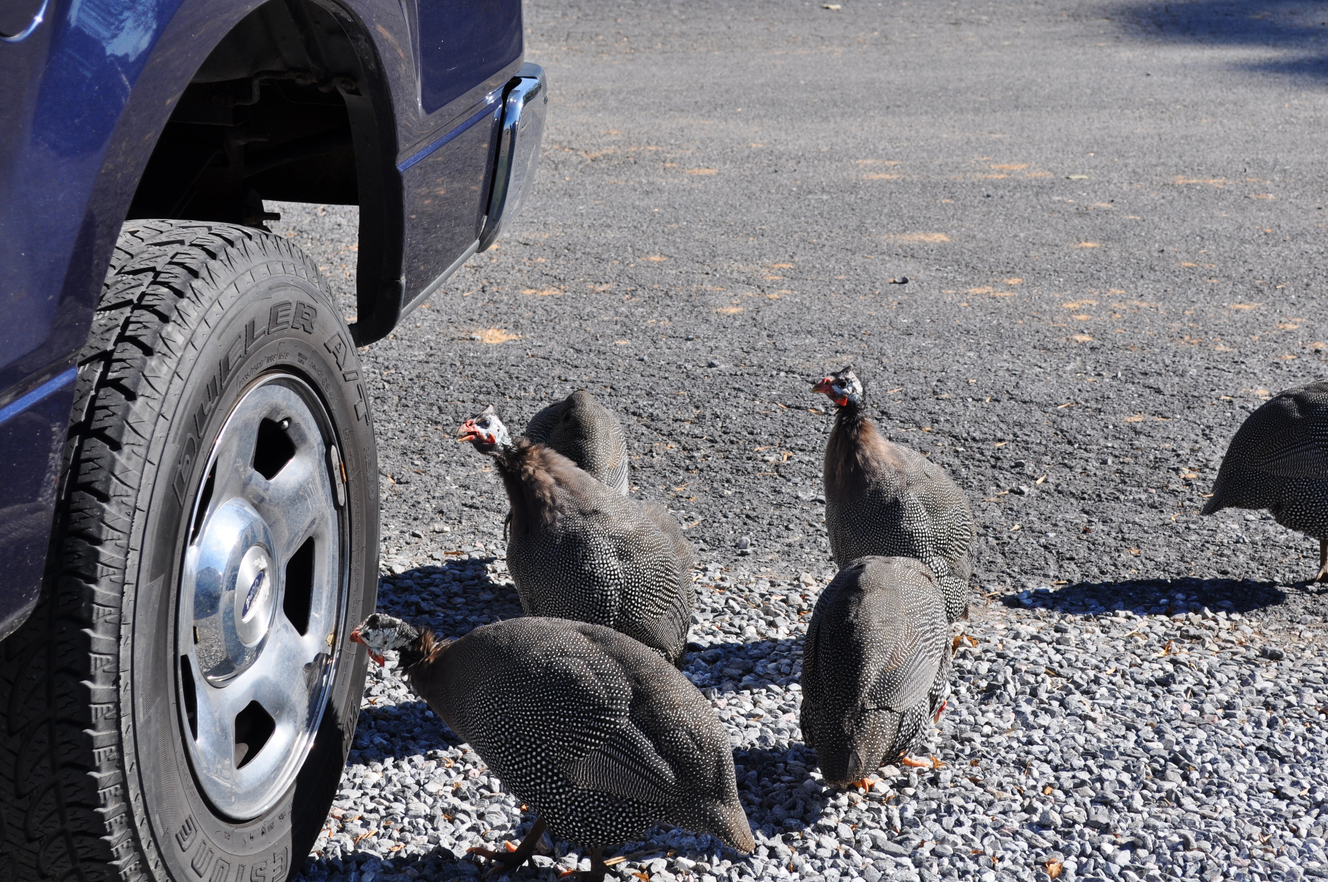 Like their guinea hens who were checking out their reflections in the hub caps of our truck. Interesting animals.
