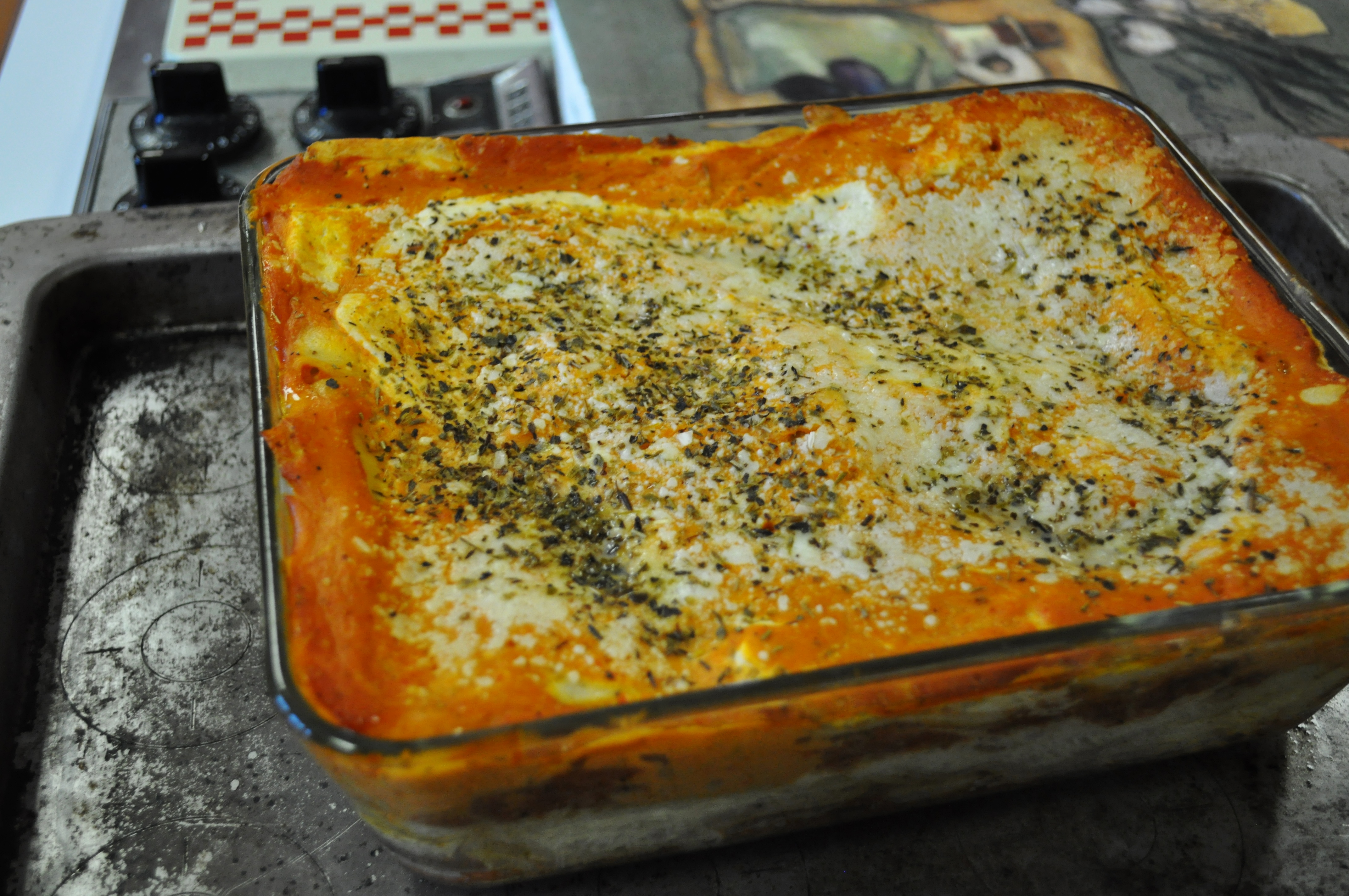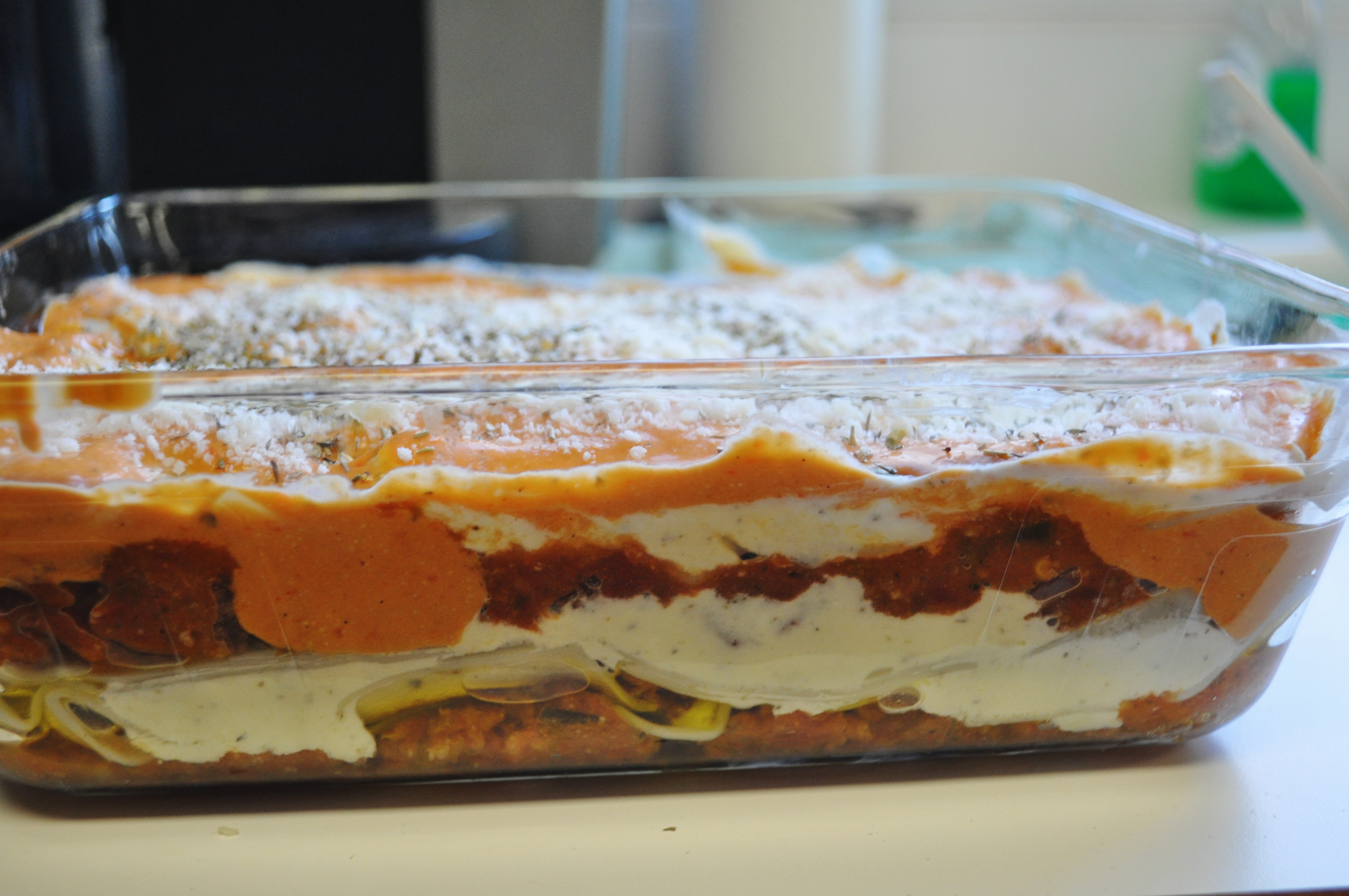 If I didn’t have those extra noodles, I would have been fine, but that third layer needed sauce, so I used about half the jar of that vegan roasted pepper sauce.