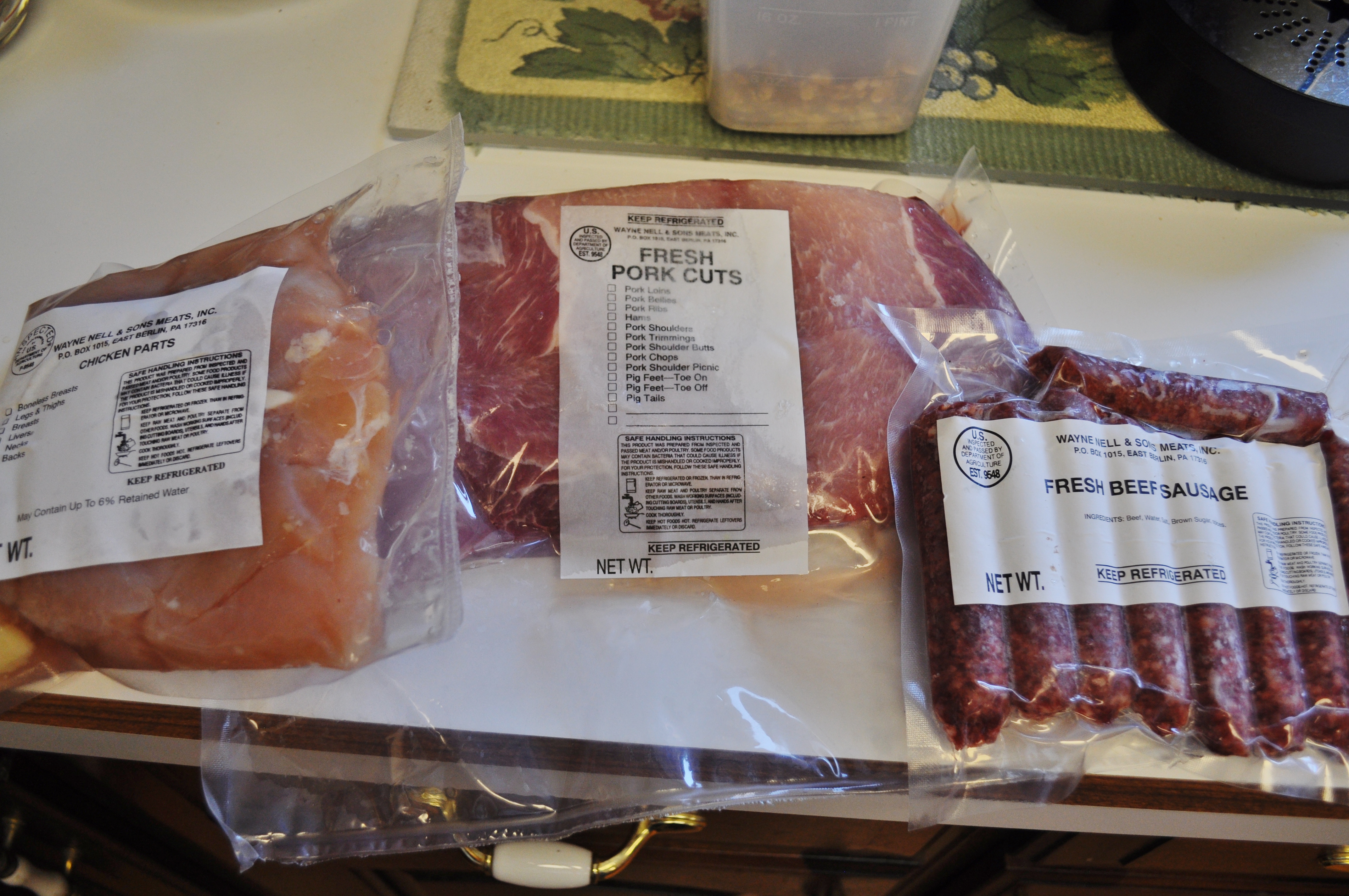 Wayne Nell and Sons supplies much of their meats. We got chicken breasts, country style boneless pork ribs and beef sausage. You can opt out of pork if you wish.