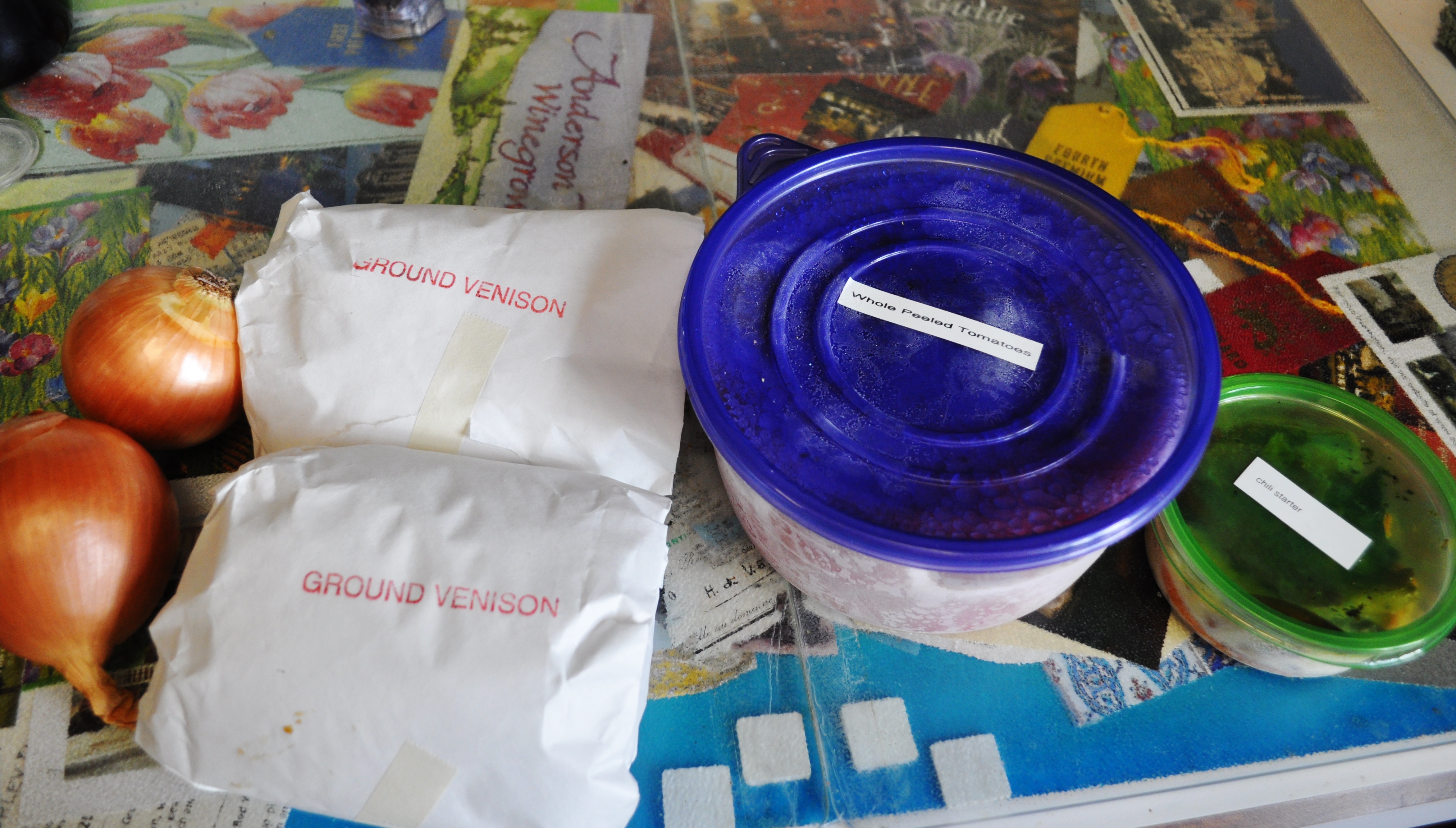 Using my freezer items. The last of the ground venison. My roasted peppers aka the chili starter. Larriland tomatoes, that were blanched and frozen whole.