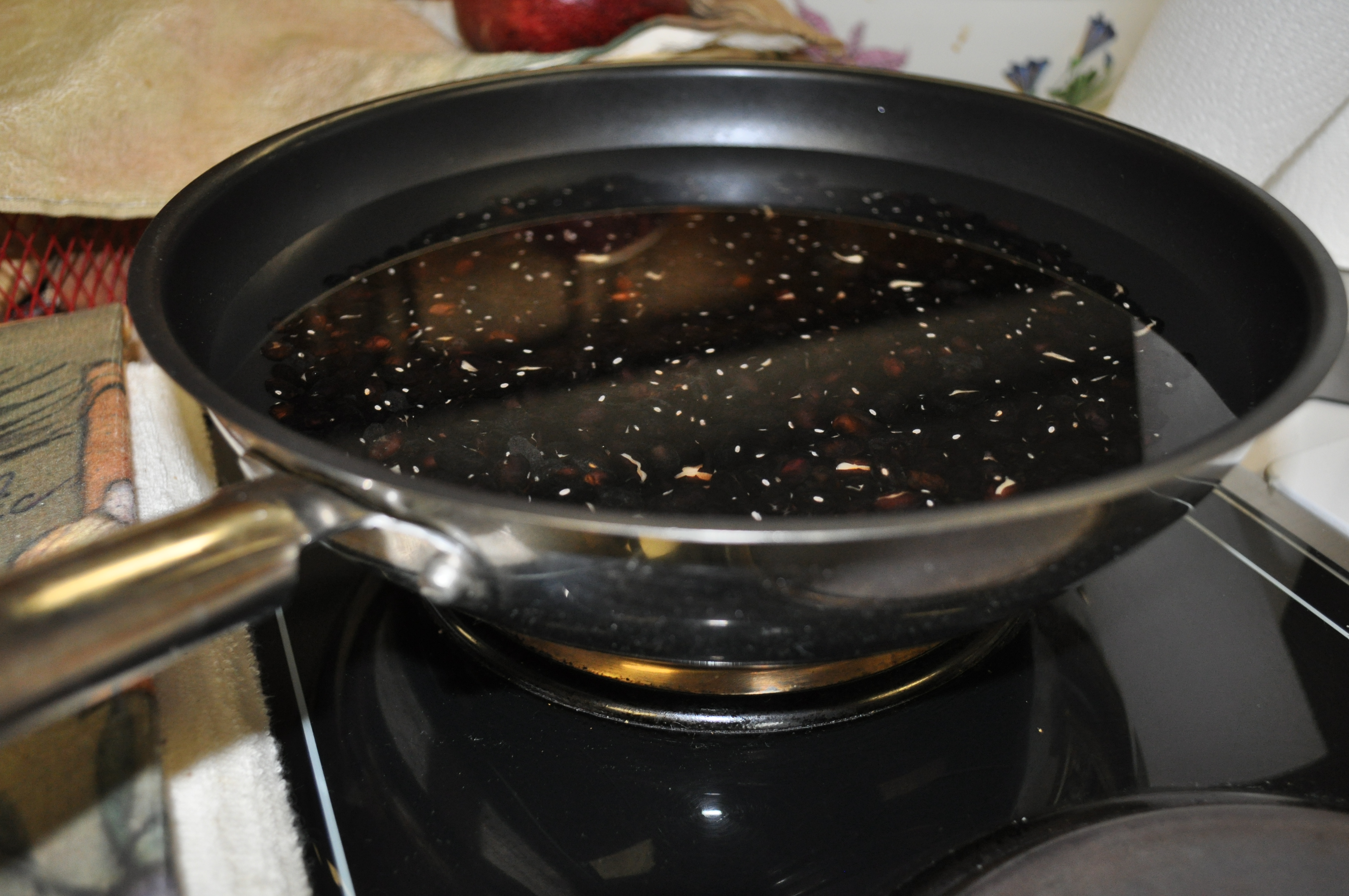 Half the turtle beans from the Friends and Farms basket. They were soaked overnight. Drained, rinsed and cooked until almost done (making sure to boil them for ten minutes before simmering for two hours). Also adding that tablespoon of baking soda, recommended for those of us with hard water.