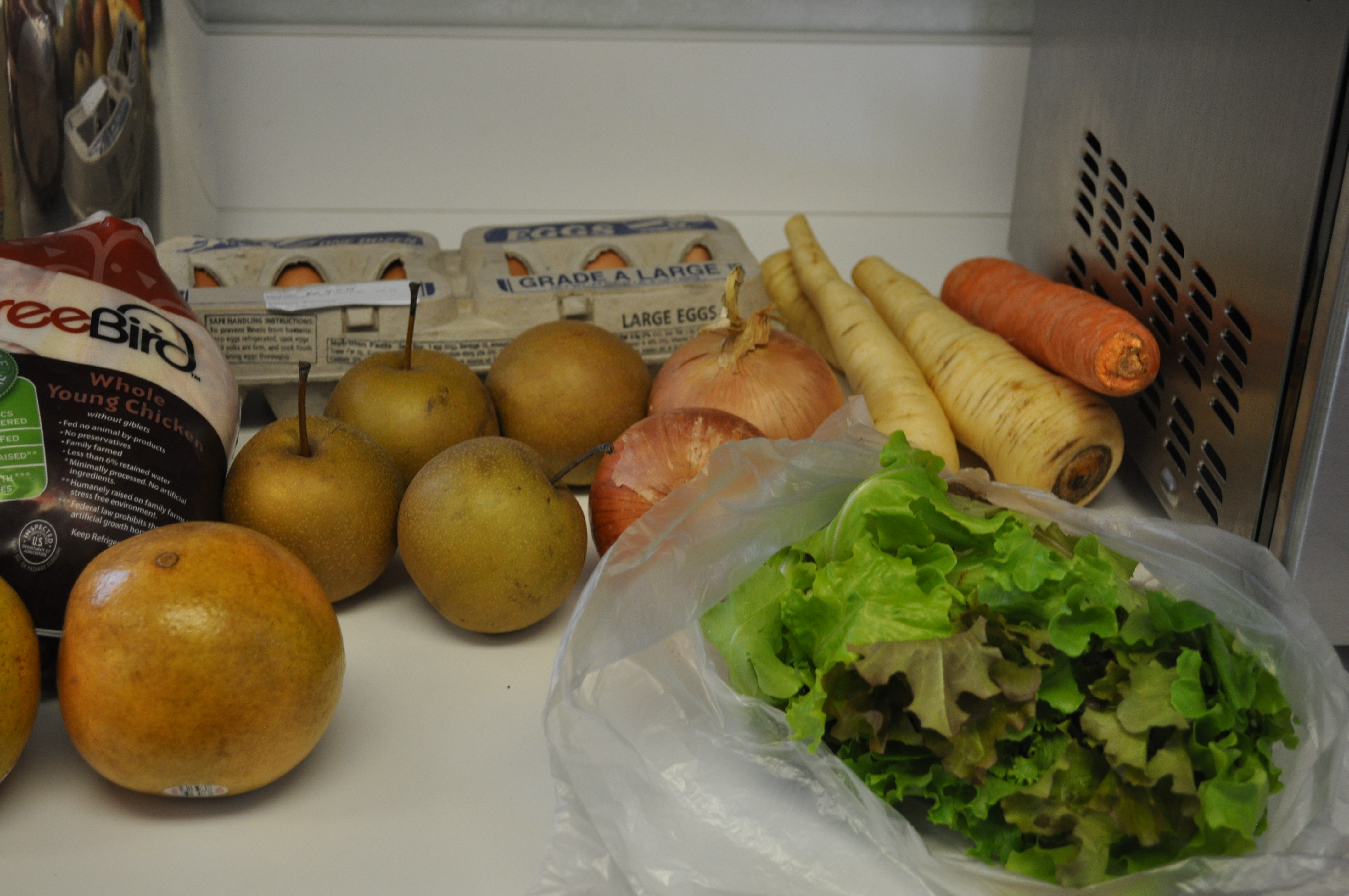 I get a dozen eggs weekly, instead of milk. We are now getting eggs from a farm in Clinton MD. Mostly brown eggs, with a very deep yellow yolk. We got four more Asian pears. Love these pears, as they are so crisp and sweet. We got hydroponic spring mix, enough for two salads. And, grapefruit. Two of those. Root veggies, said the preview. That meant a few parsnips and one humongous carrot. A couple of onions.