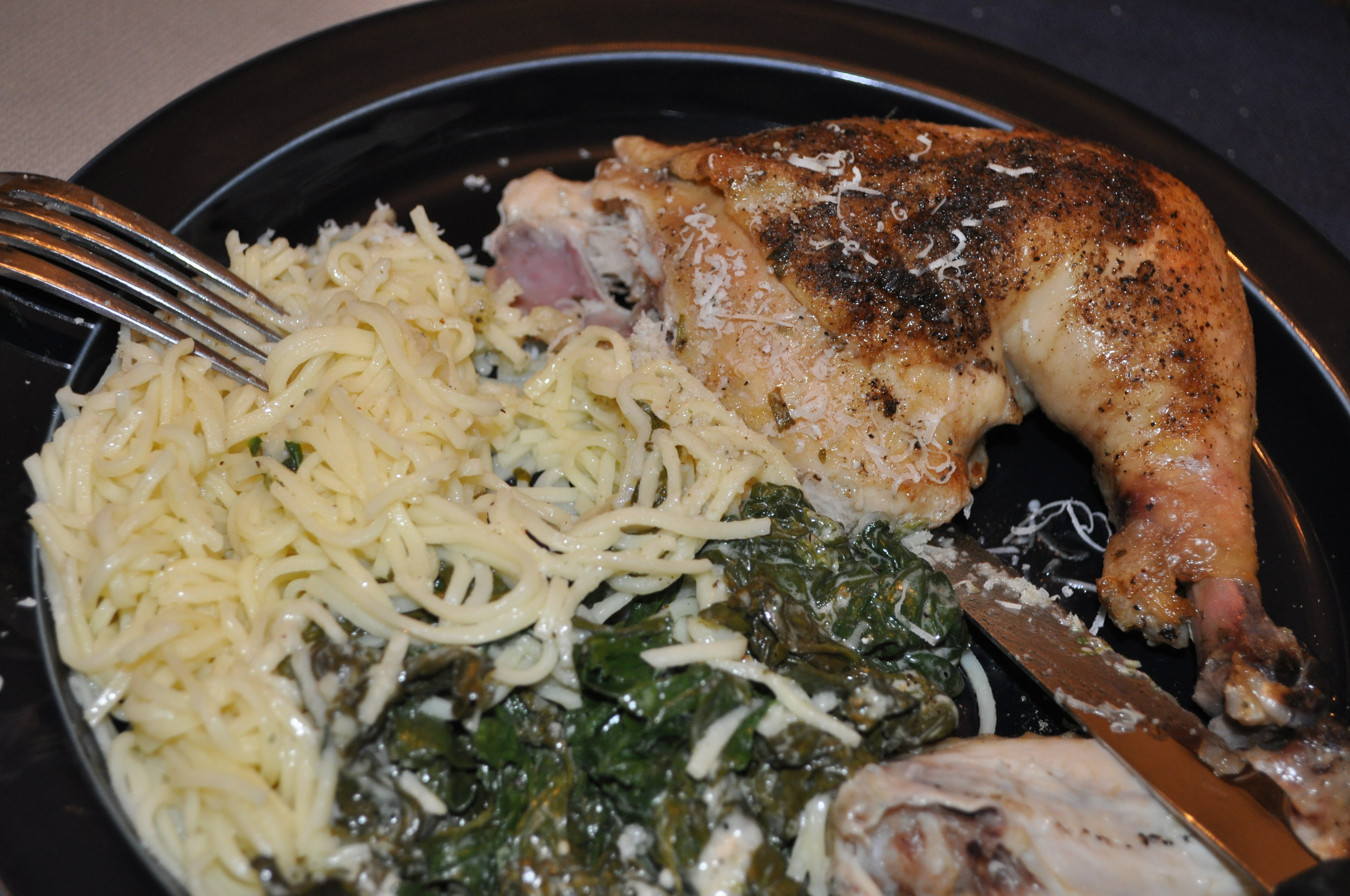 I made creamed spinach with the rest of the spinach from last week. The rest of the angel hair pasta, cooked and served with grated Parmesan and lemon infused olive oil.