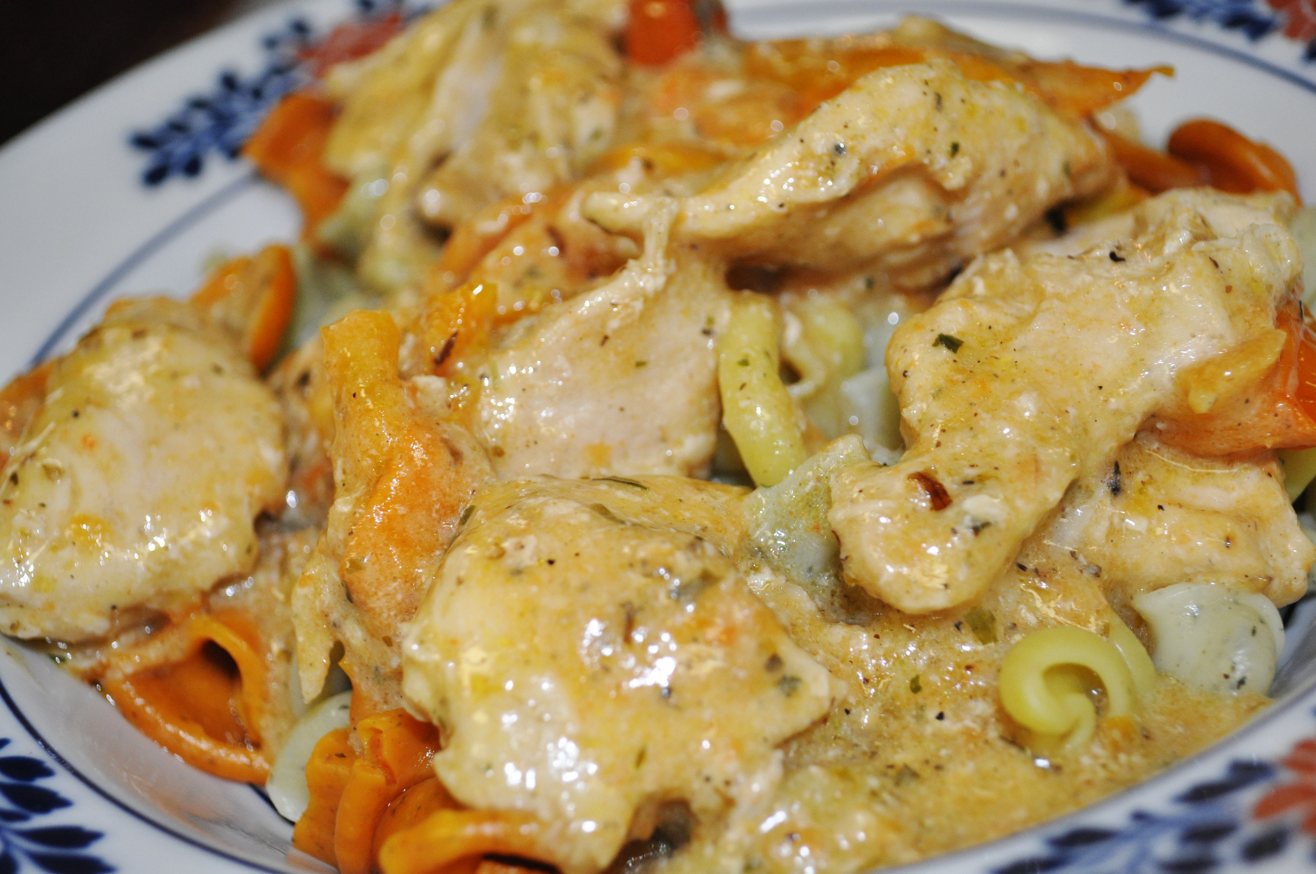 I used about four ounces of the pasta that made two servings of pasta. Added about half the chicken mixture. That leaves me with half a pound of chicken to make the soup later this week.