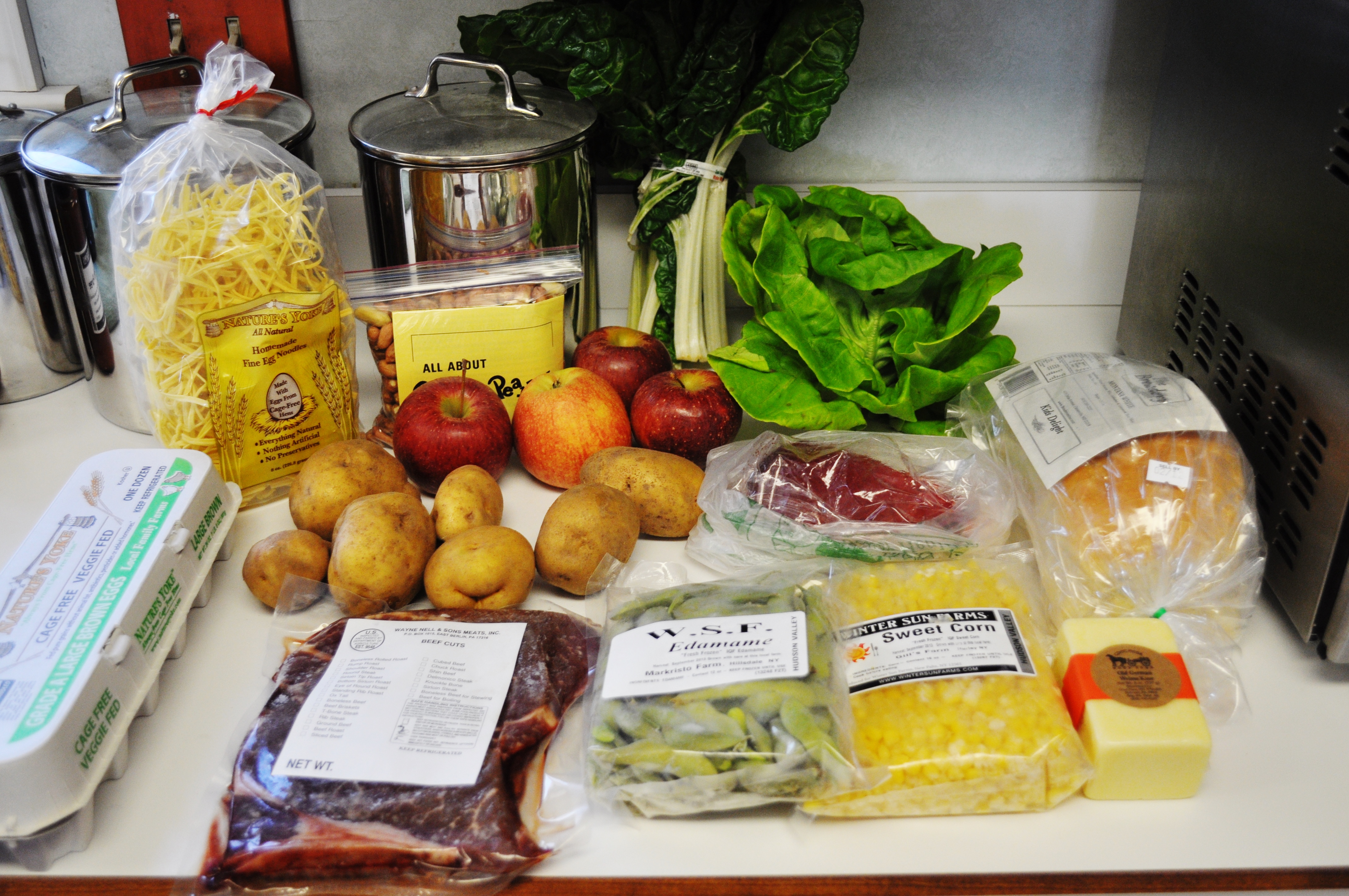 There are the usual winter veggies and fruit. Like potatoes, apples, Swiss chard. There is an interesting cheese, a Weissa Kase, from an Amish farm.