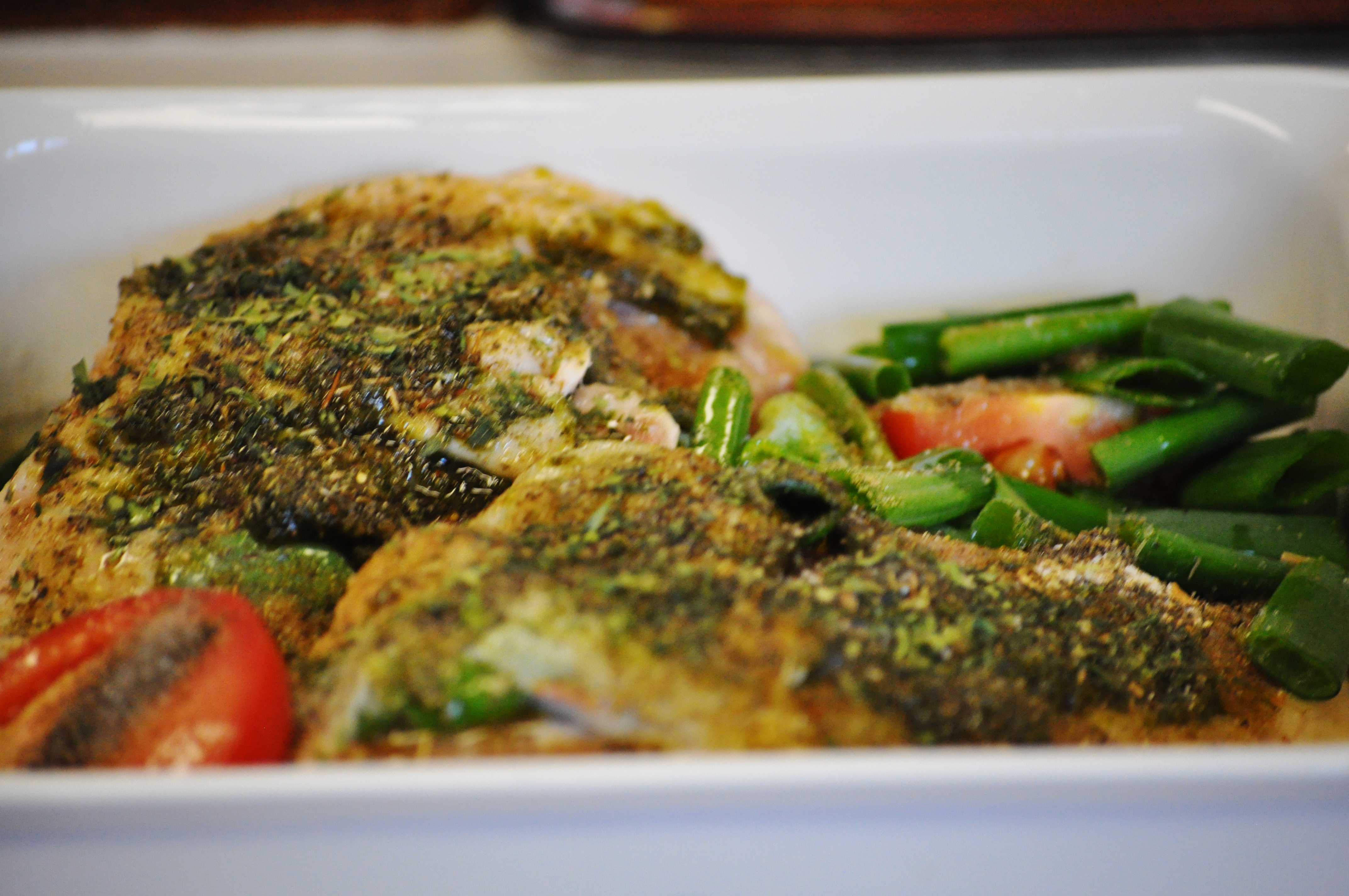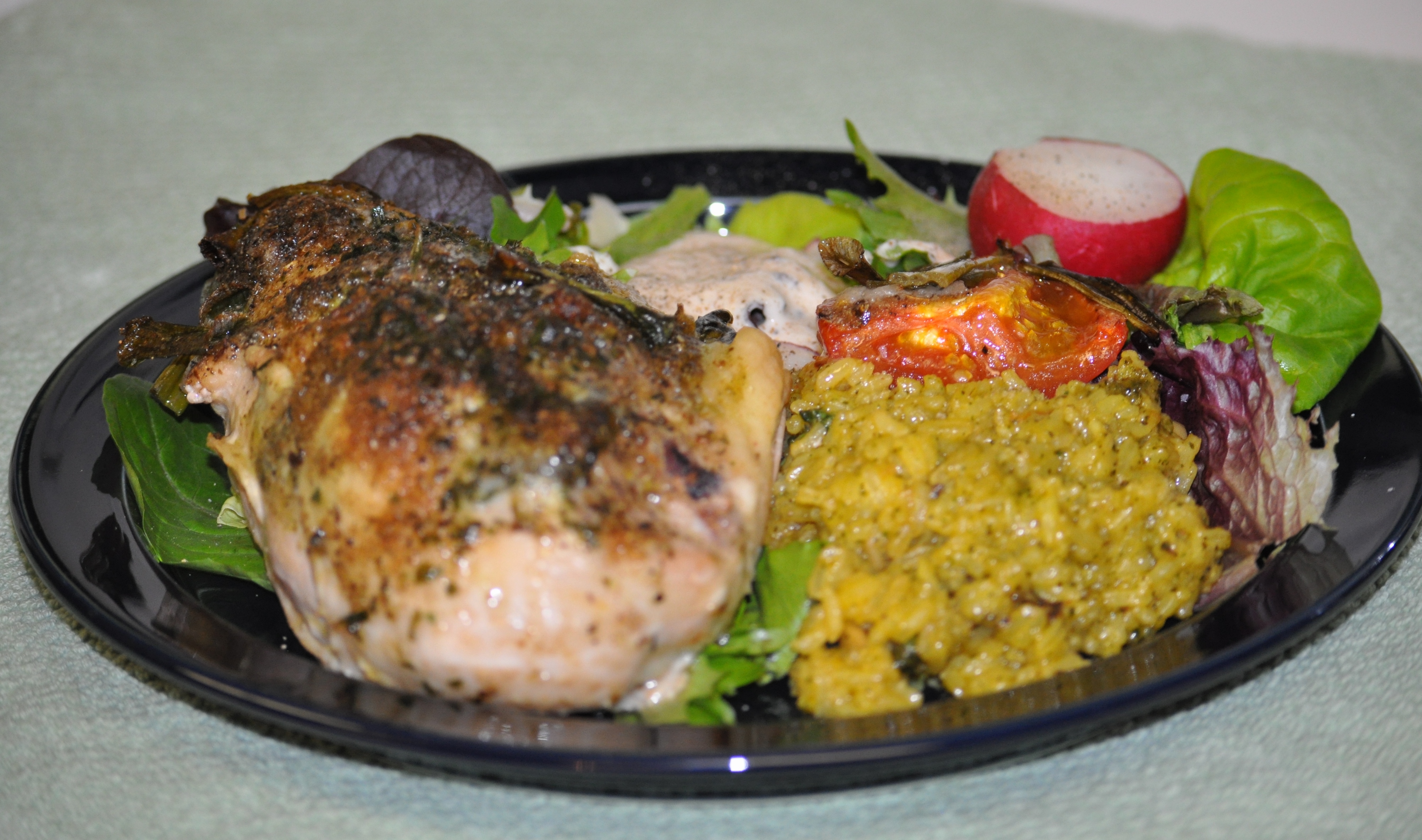 Pesto is on the chicken and in the rice. Those split chicken breasts I got in my basket Friday were excellent. I used a simple method of baking them.