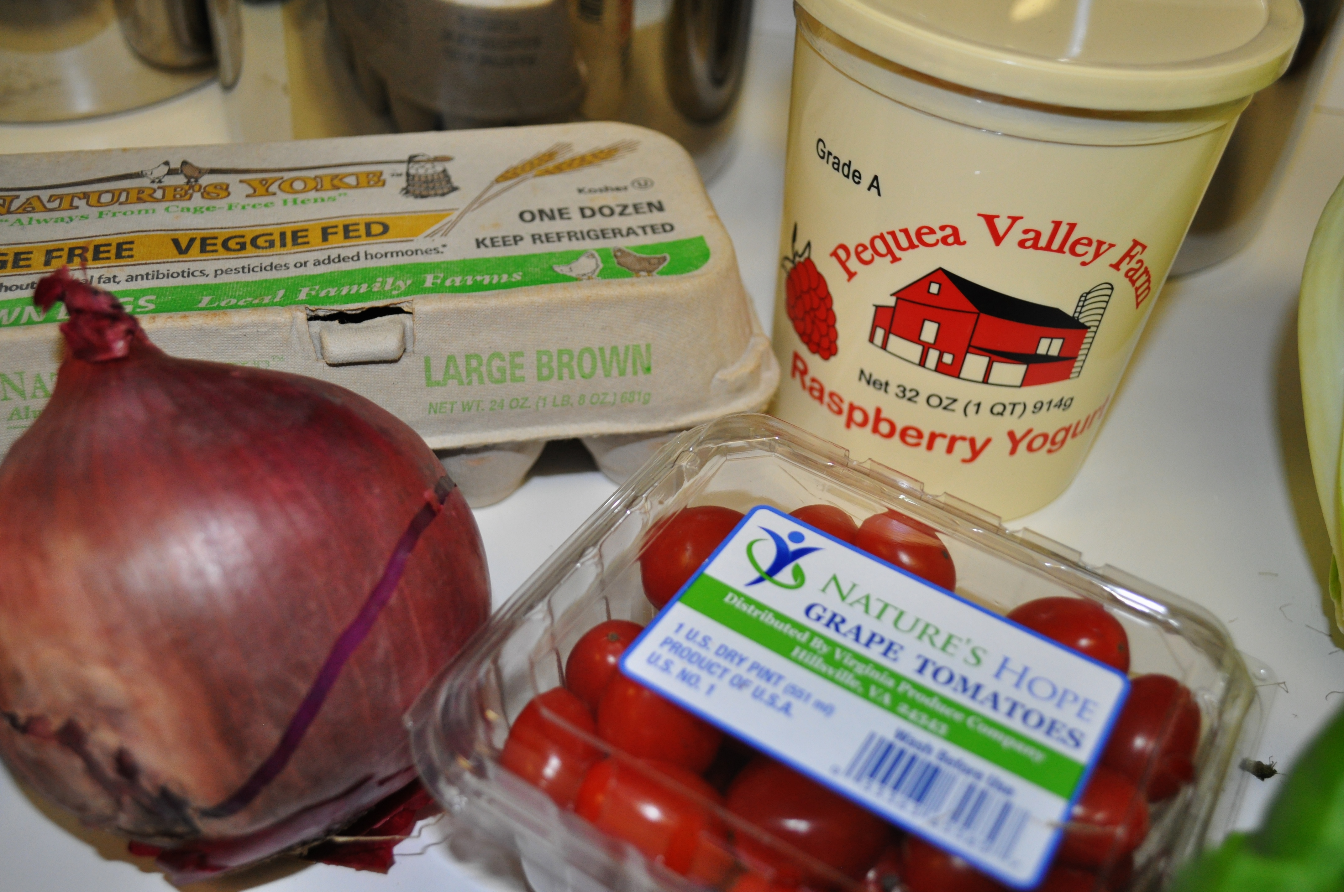 Grape tomatoes to make a Bibb and tomato salad. Eggs (which I now get weekly instead of milk). My favorite Amish yogurt, which I now get biweekly (substituted this instead of the biweekly eggs others get).