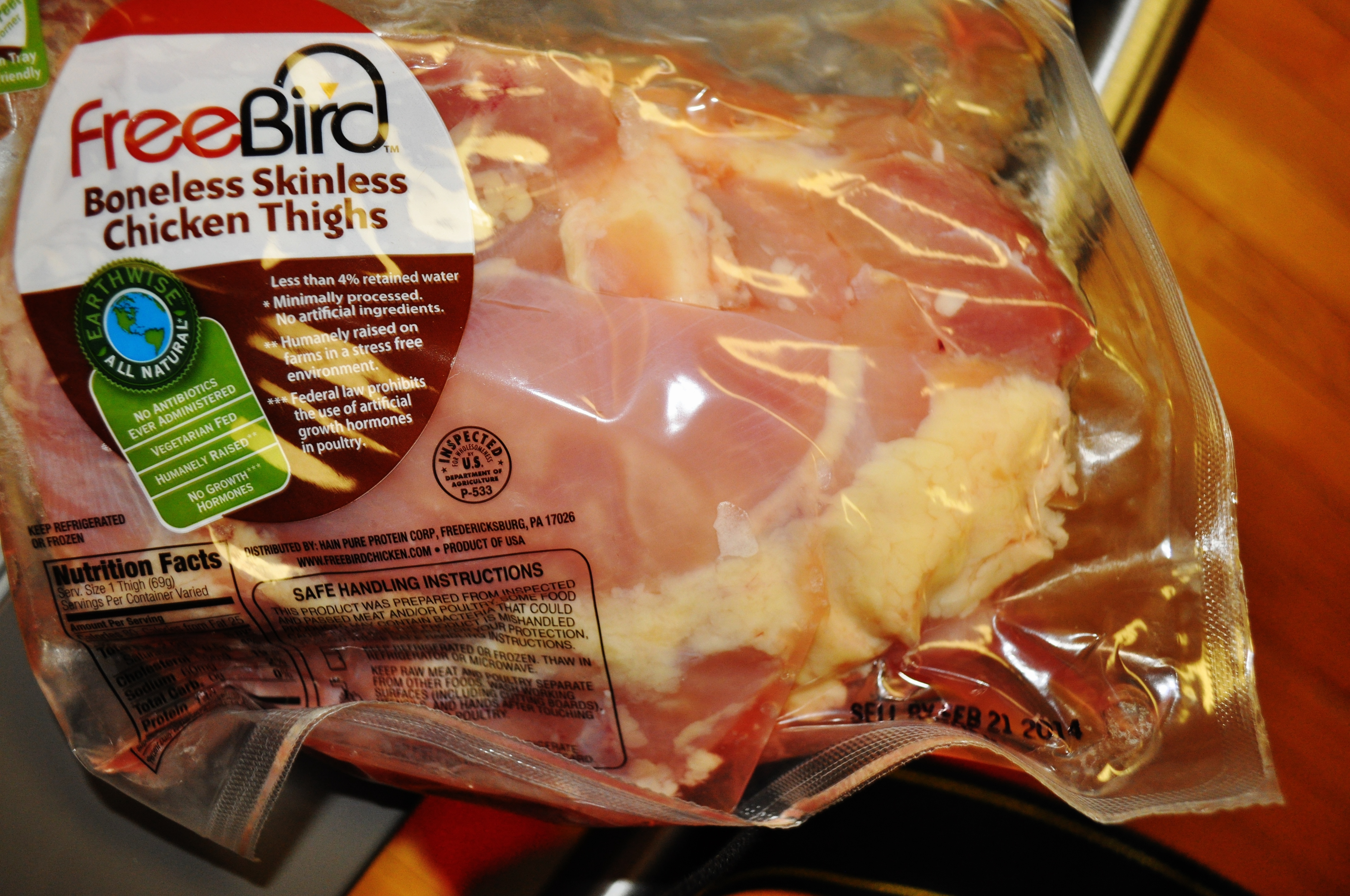 This week, boneless/skinless chicken thighs. I am thinking of all sorts of things to make with this chicken. Freebird is just awesome. You can enter your package code and “meat” the farmer who raised this chicken.