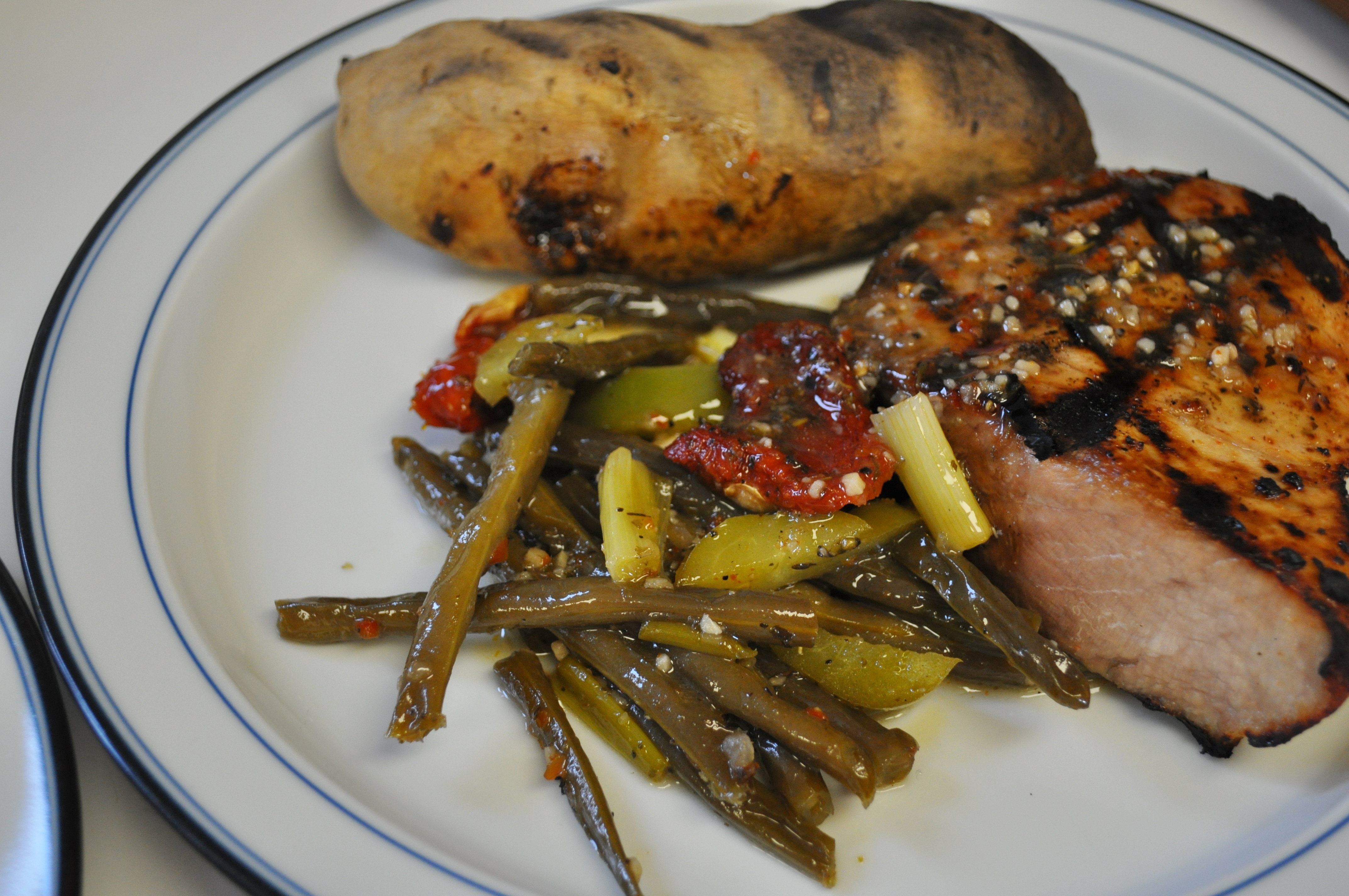 Green beans from the IQF packet. Scallions. Green pepper. Sun dried tomato and garlic from the olive bar at Harris Teeter (seriously, get a container of stuff from them and use it everywhere). Italian vinaigrette for the marinade.