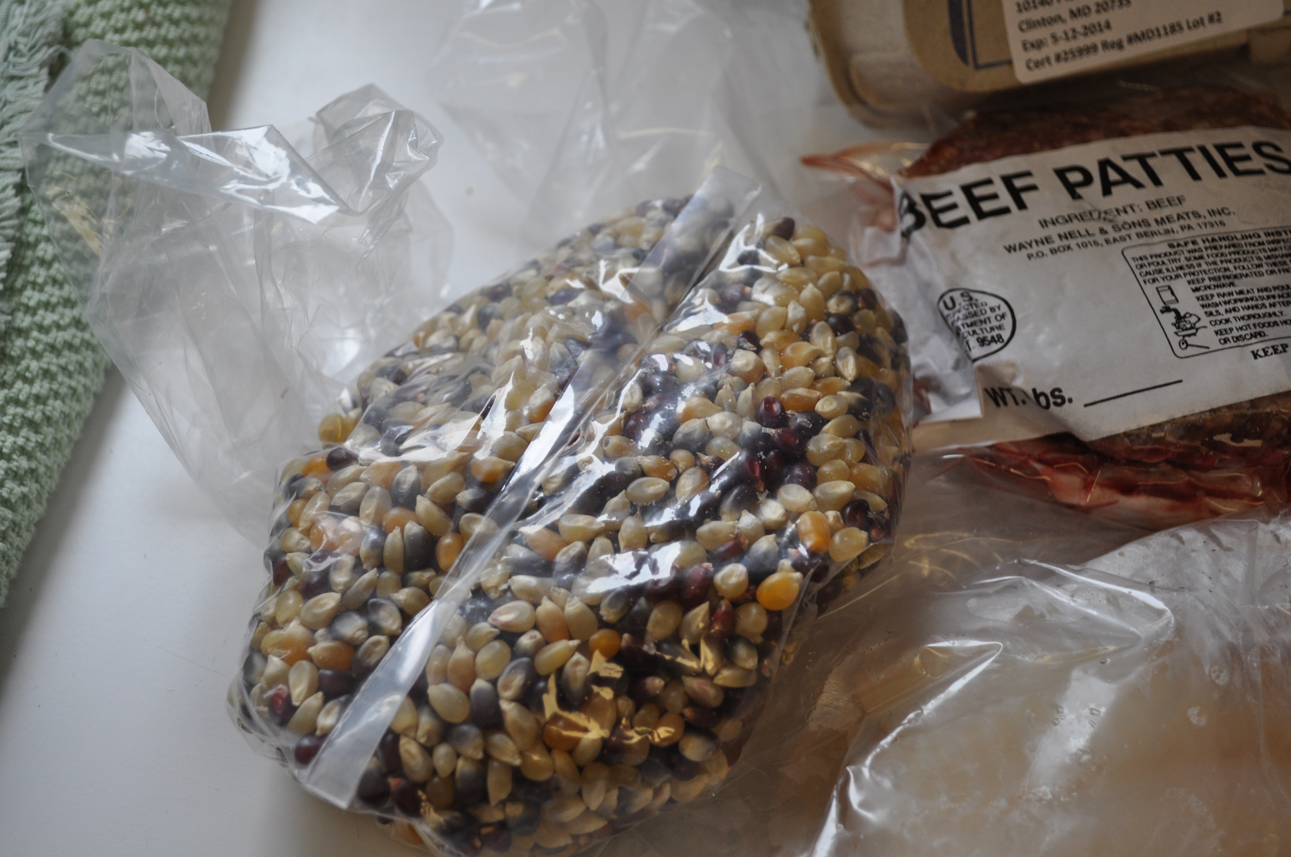 There were the usual eggs. Some nice looking Colby cheese. Cremini mushrooms. Apples, potatoes, kale, Bibb lettuce and carrots. Frozen broccoli and squash puree.