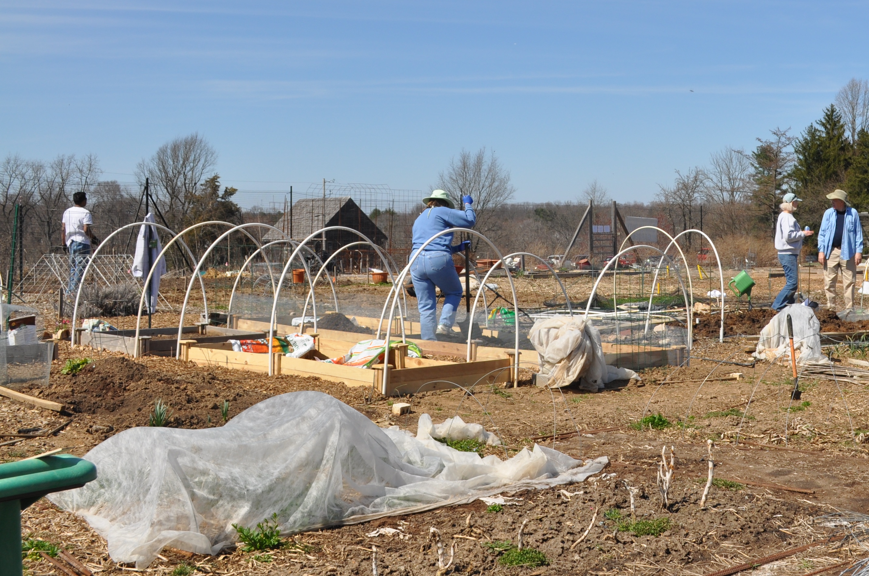 The PVC hoops are the bigger version of what we will be doing. We are using a steel hoop that digs into the ground. The lightweight row cover in the foreground above mainly protects against frost, but is a deterrent for rabbits and other pests. We bought a heavier weight cover, which is a little more resistant and not prone to tearing in high winds.