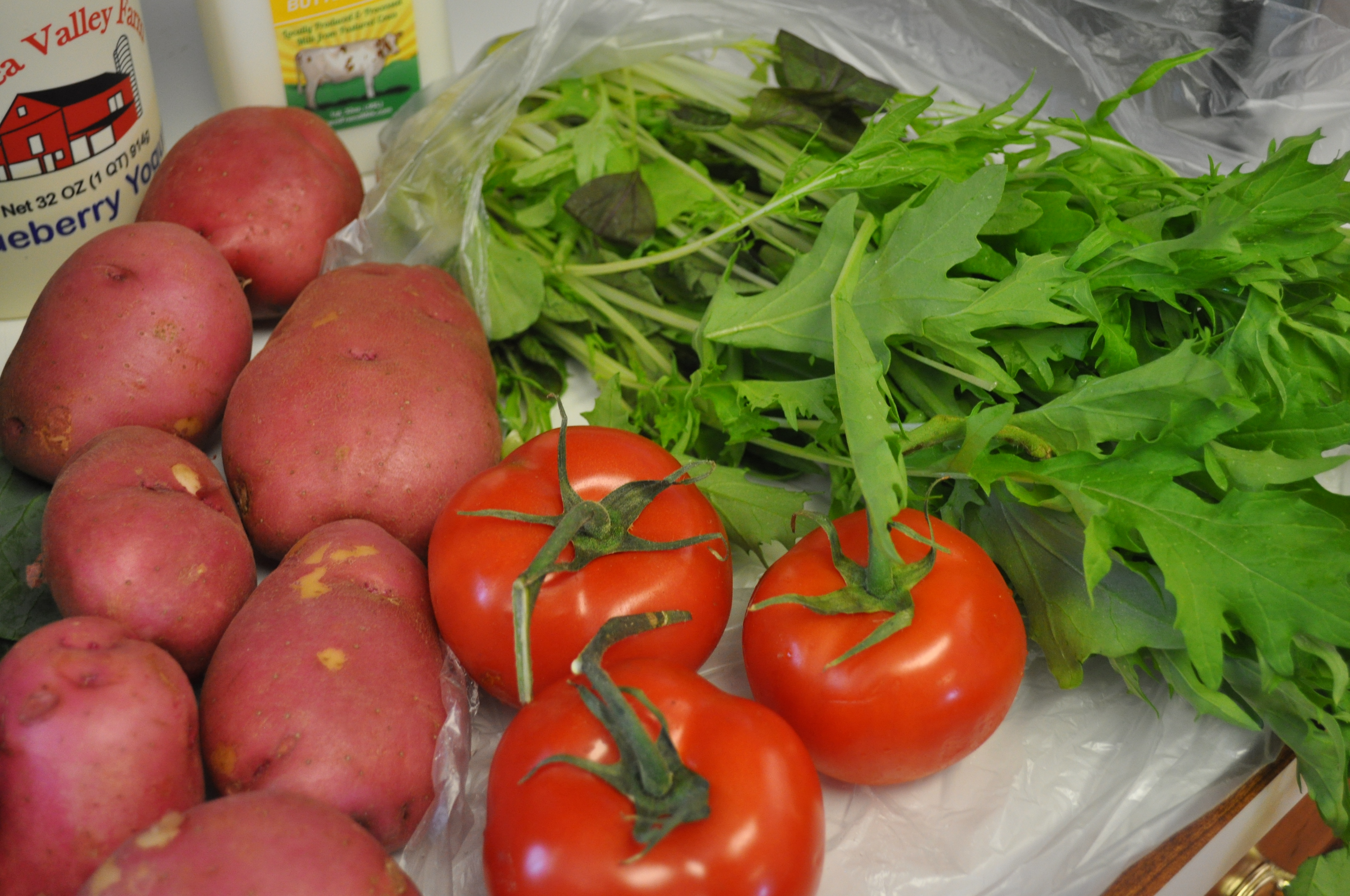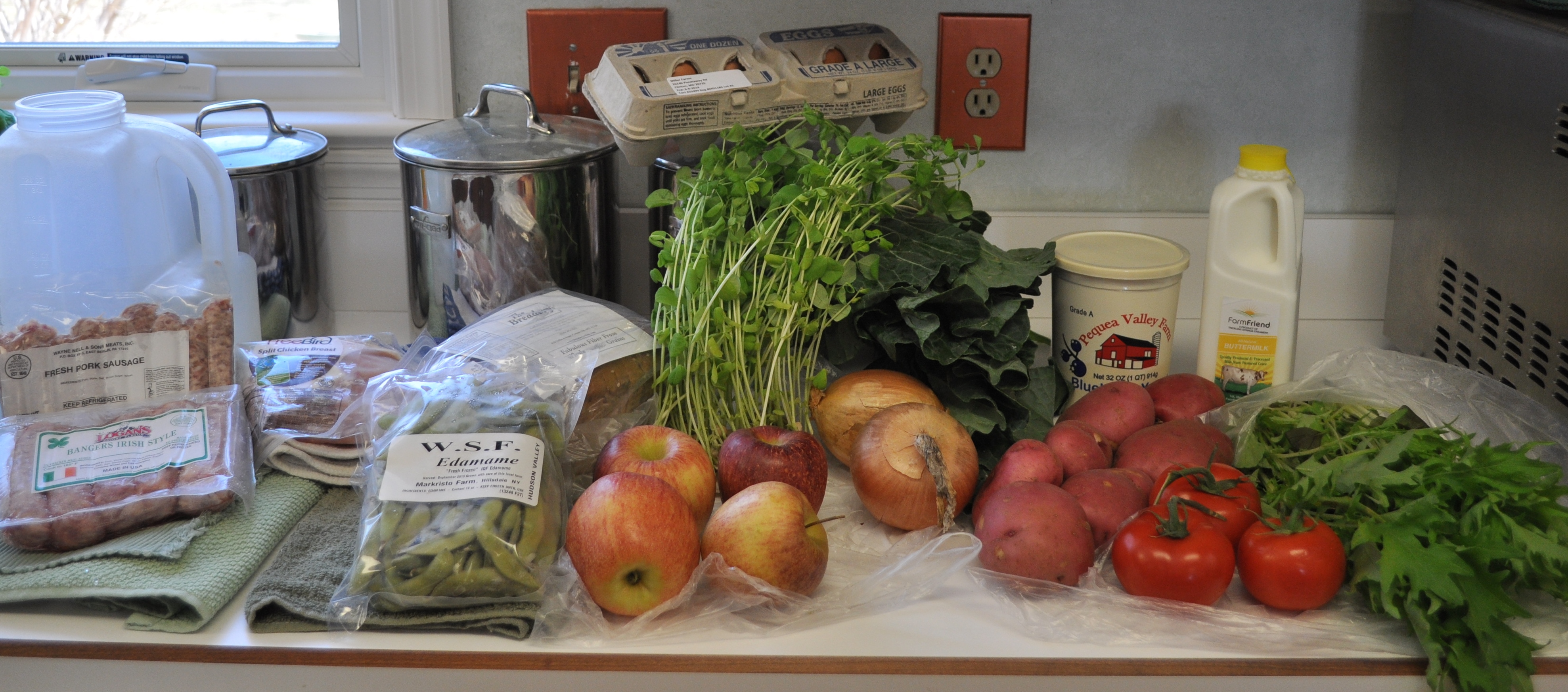 We got edamame. That was a bonus. Spring greens. A mess of collard greens. Those tomatoes. Potatoes. Apples. Pea shoots. Onions. The bangers. Chicken. Breakfast sausage. I got yogurt for the eggs, and eggs for the milk. My standard switch. Grains Galore bread from the Breadery.
