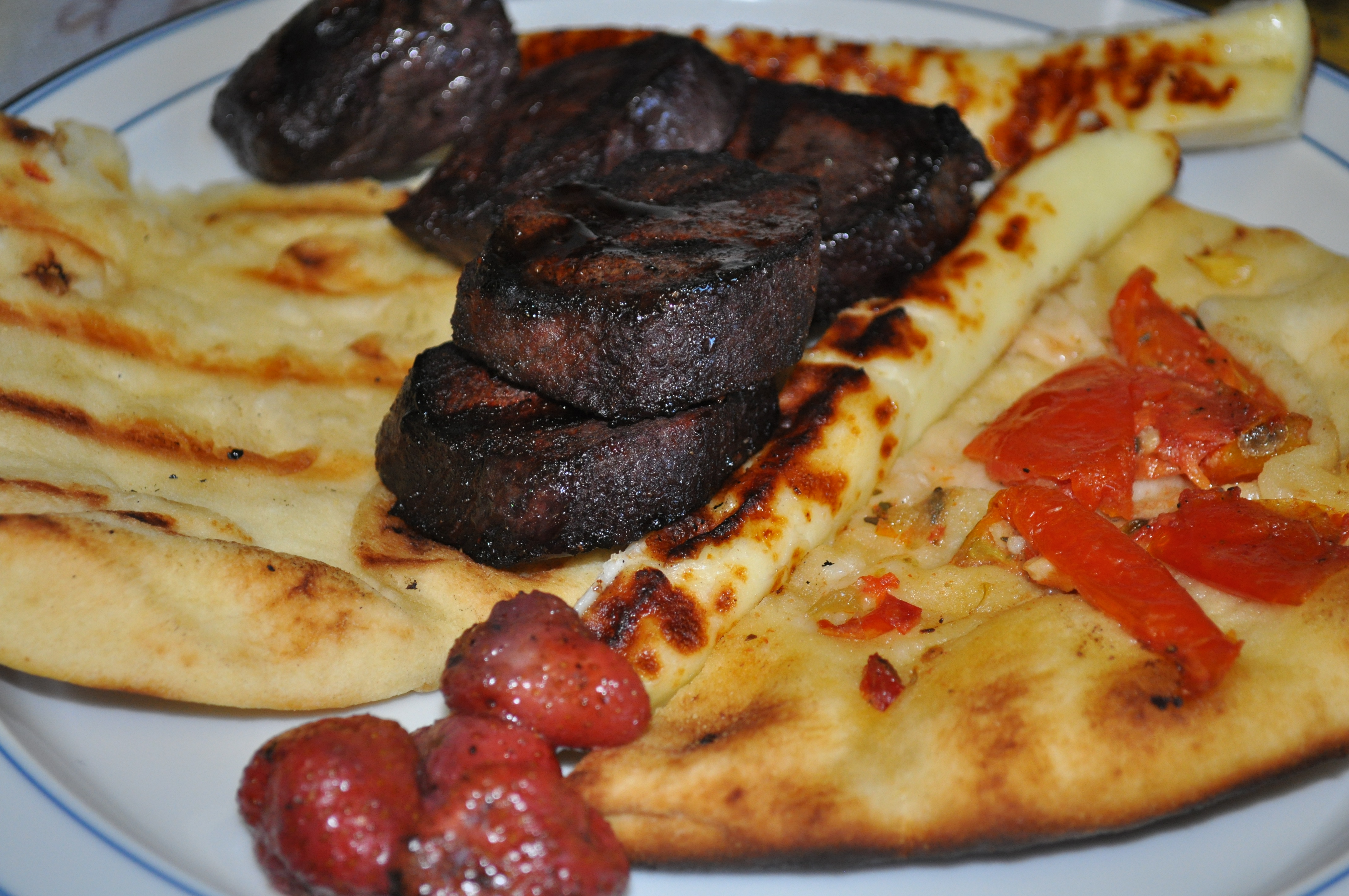 Venison tenderloin. Grilled until it is medium rare to medium. Served with strawberries. A fitting way to end the adventure of a freezer full of venison.