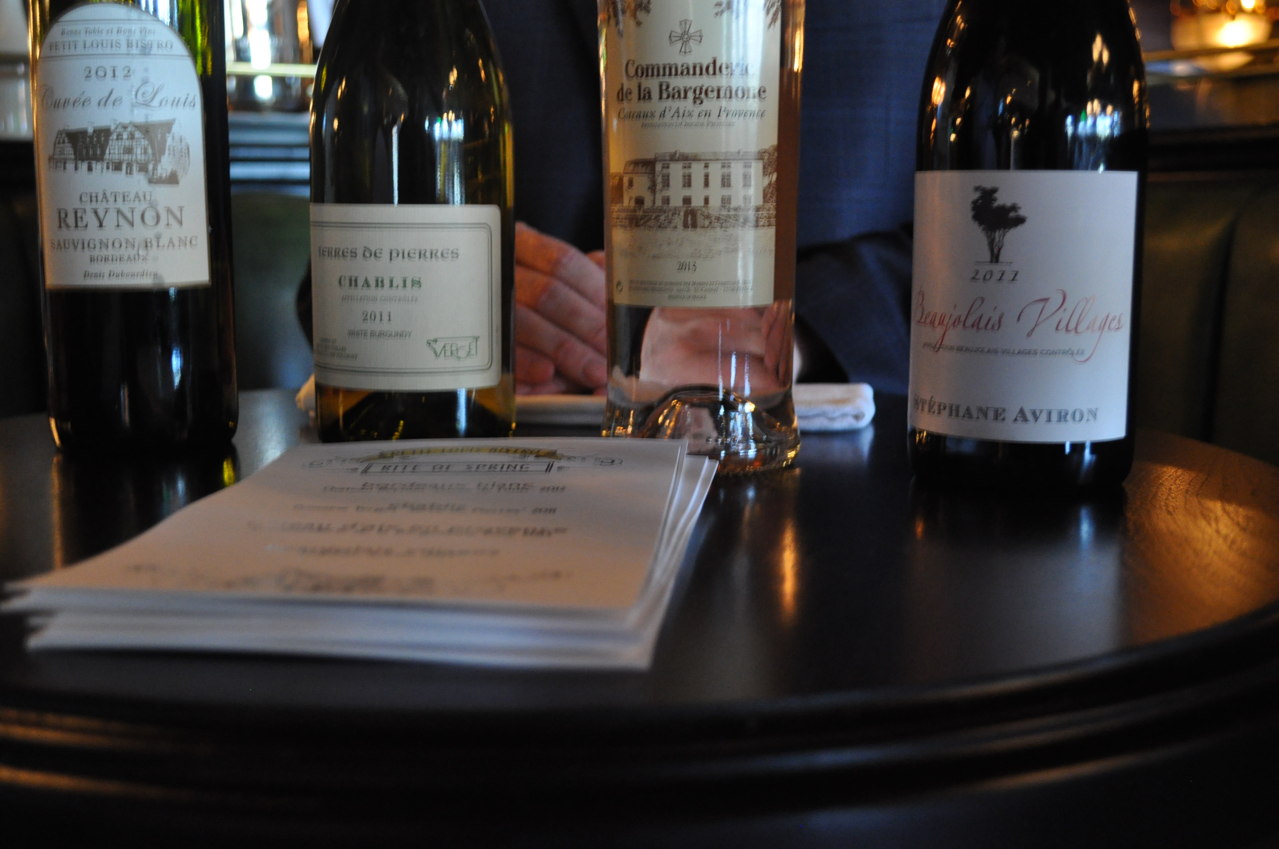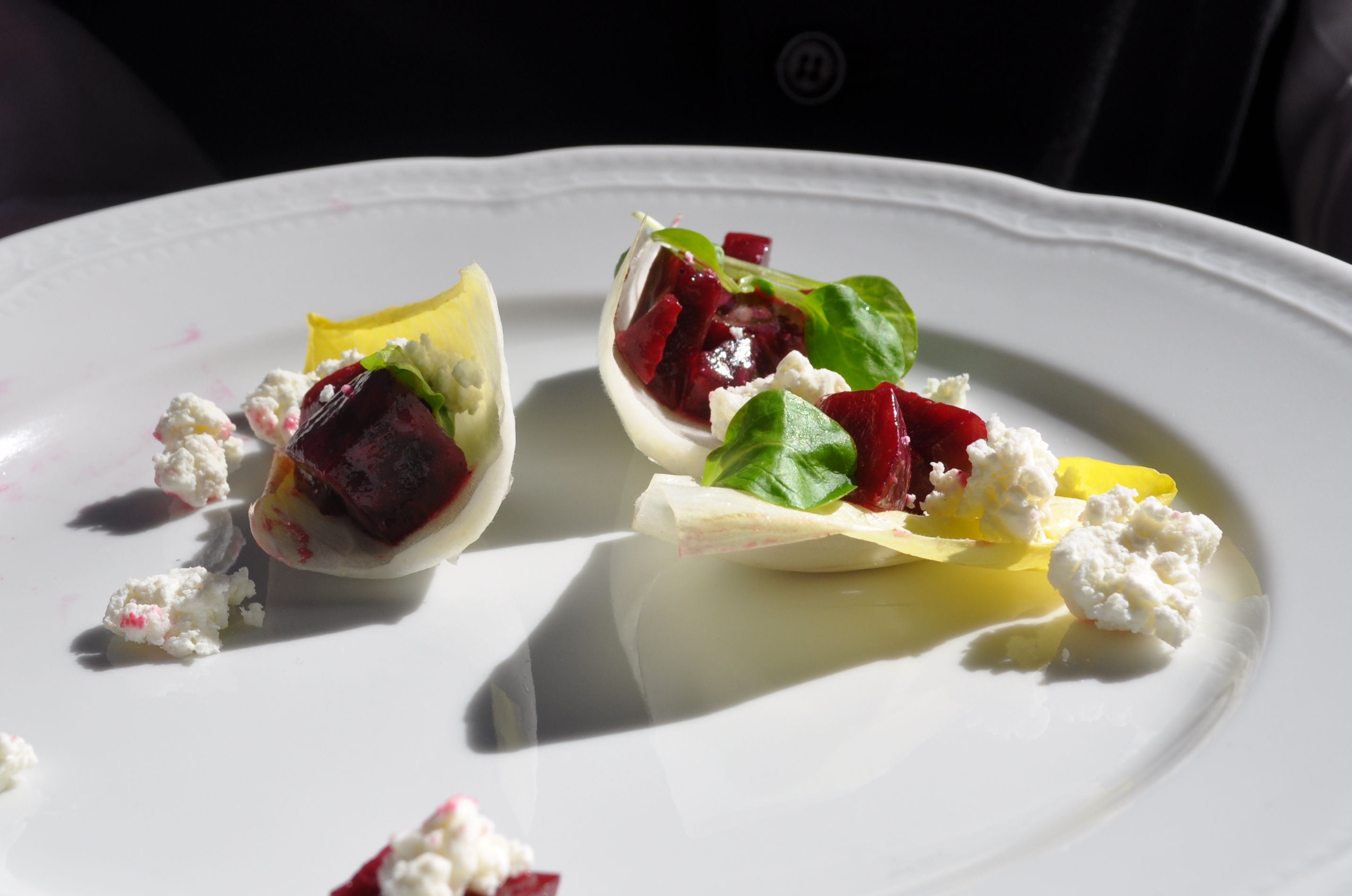 Besides these beet and chevre bites, there were cheese pastries and a game bird terrine. Inside, four wines were being sampled.