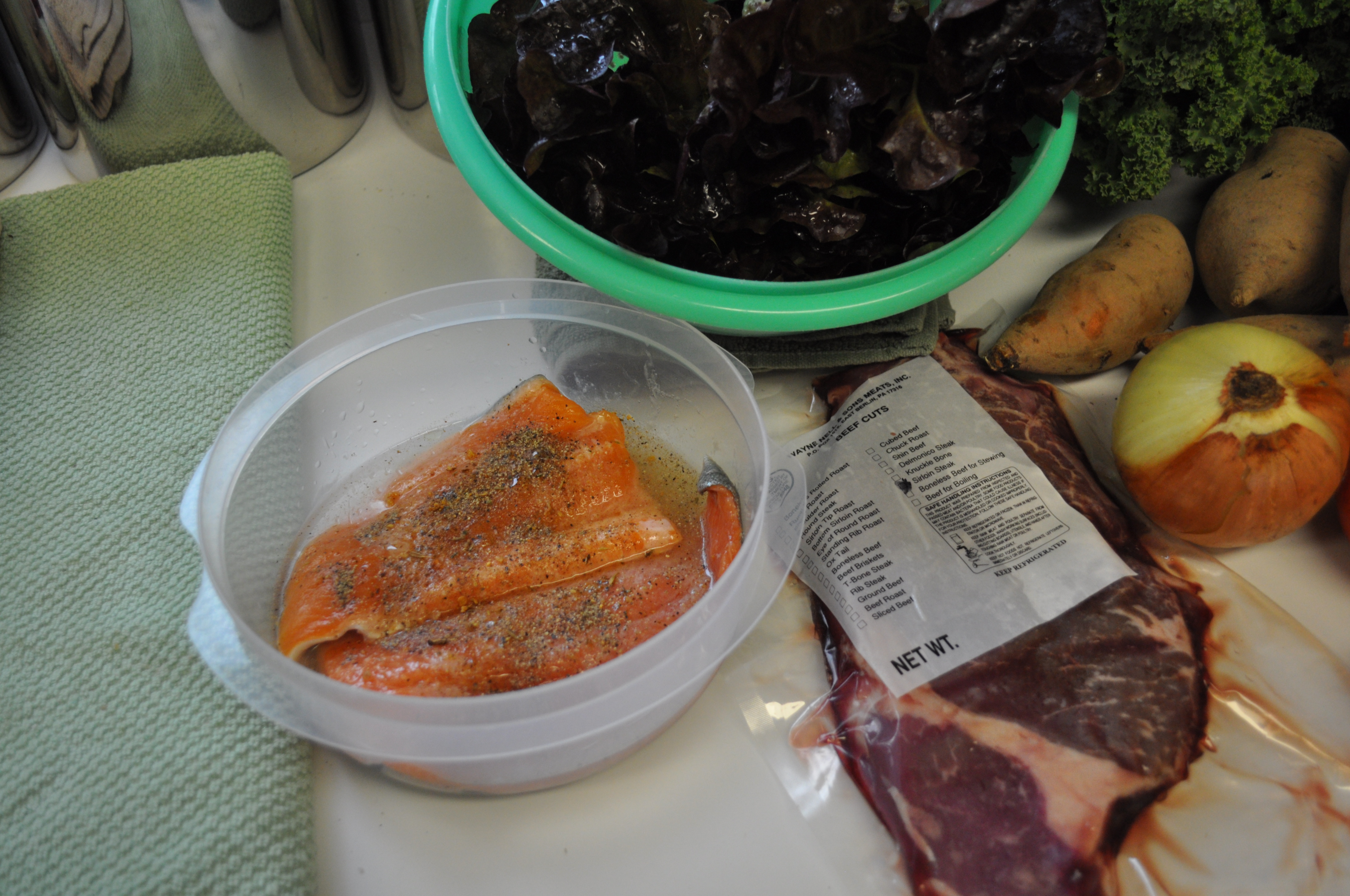 Arctic char. Which almost immediately was being marinated in wine, oil and spices. Next to the char was the package of sirloin steaks. They were the proteins this week.