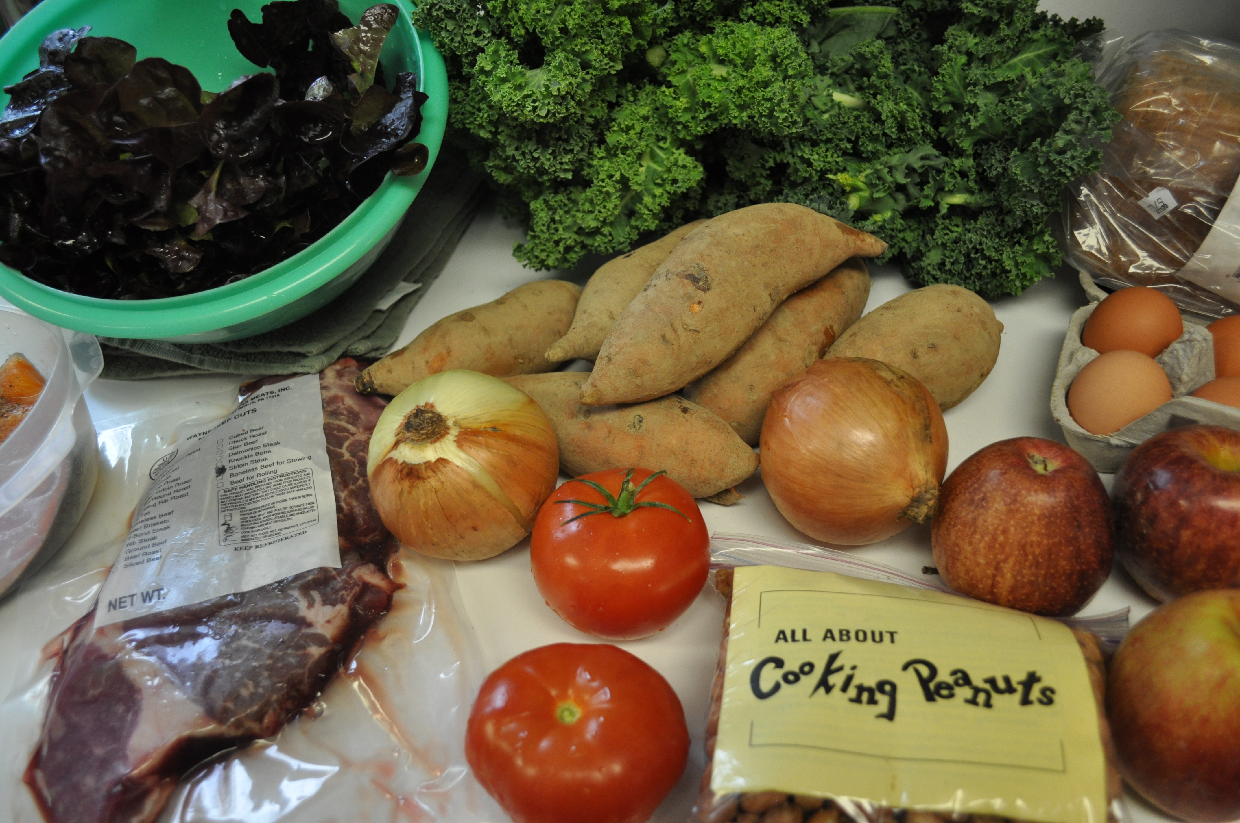 Red leaf lettuce. Greenhouse tomatoes. Sweet potatoes. A boatload of kale. Onions. Apples.