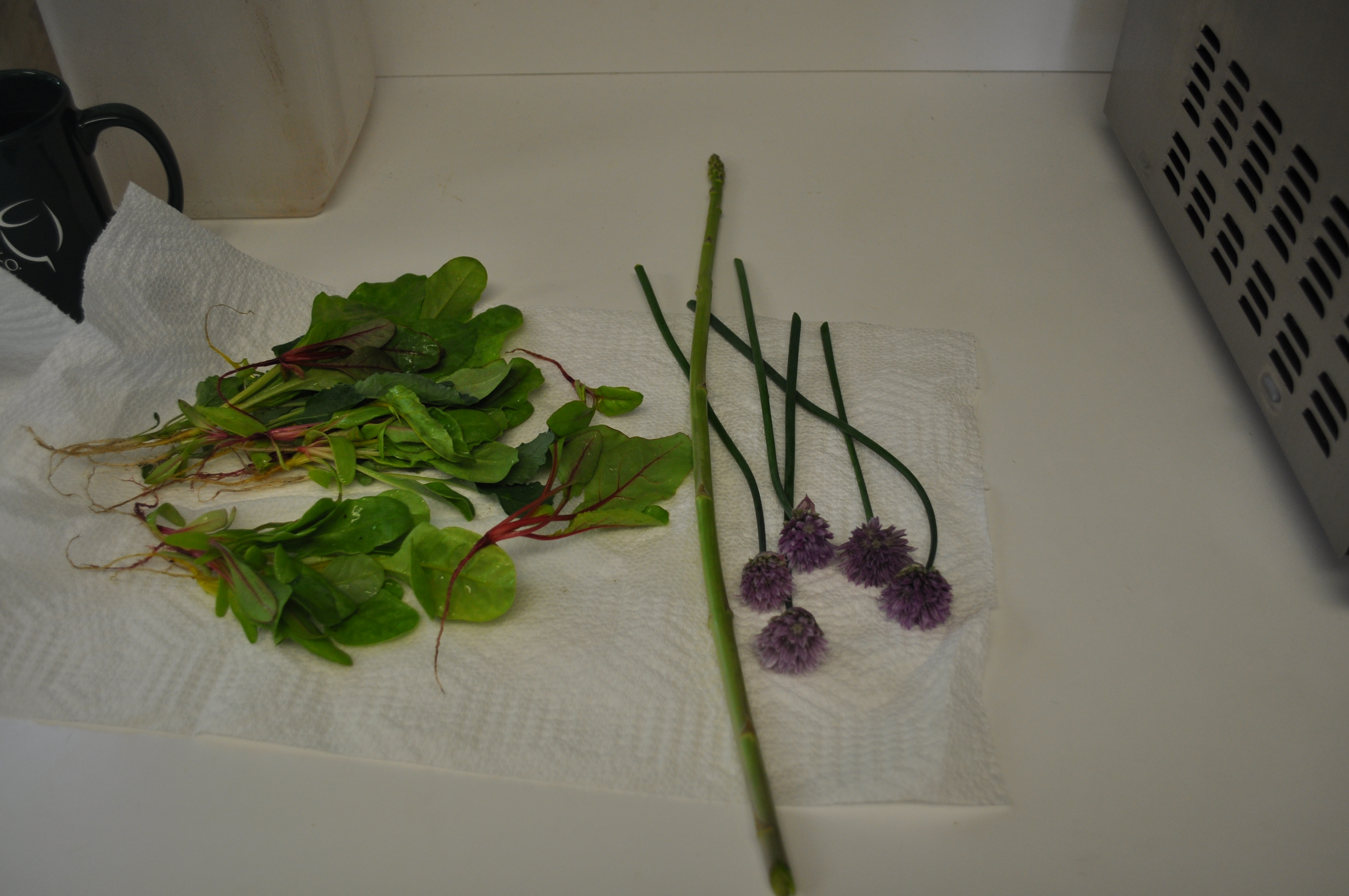 Some greens. A few blossoms. The one two foot long asparagus from the driveway.