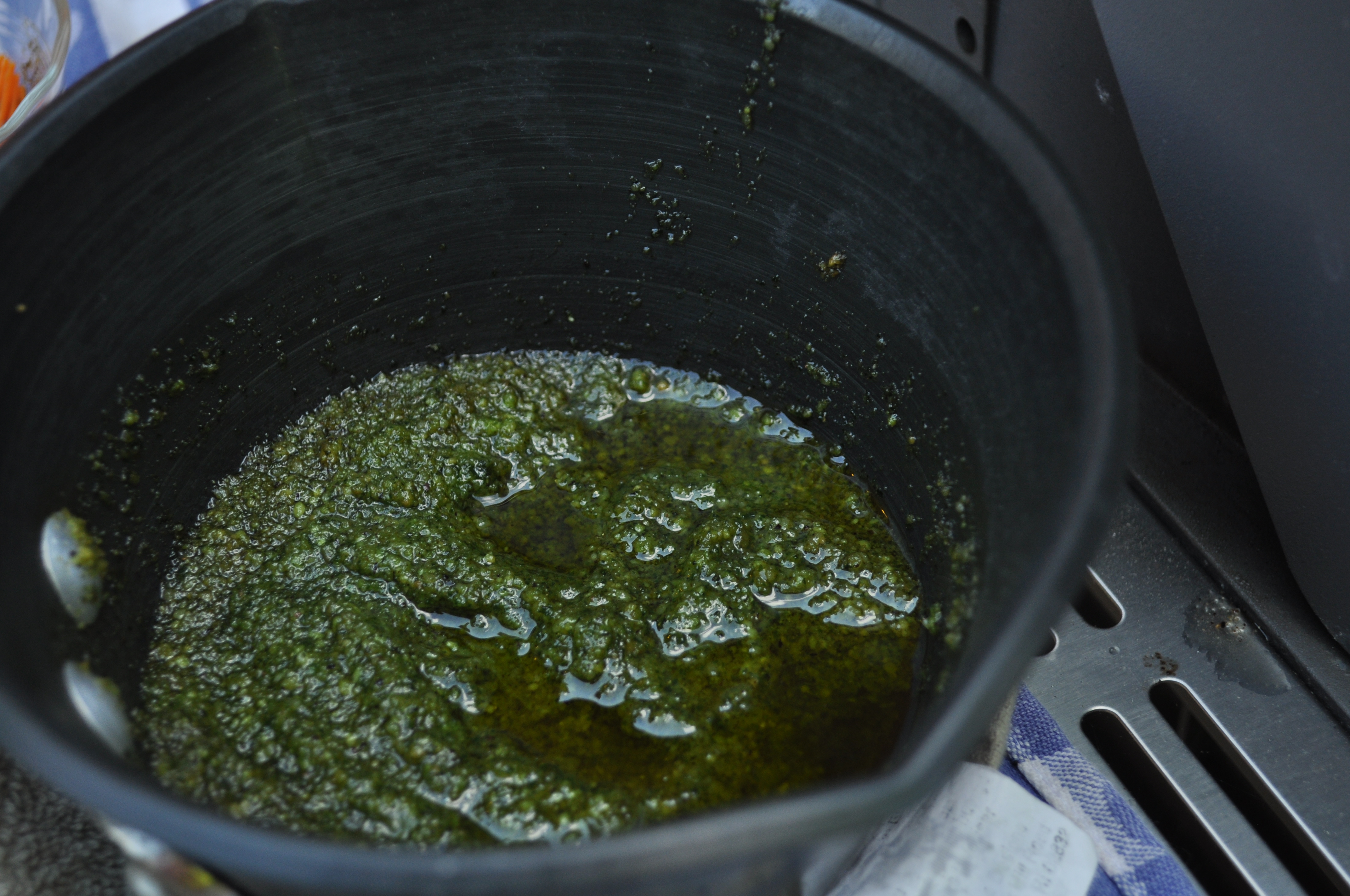 All seasoned with one of my pesto concoctions, defrosted from the freezer. This one was a mixed greens pesto, made last summer. Since it is almost garlic scape season, I need to finish off the last of the pesto containers from the basement freezer.