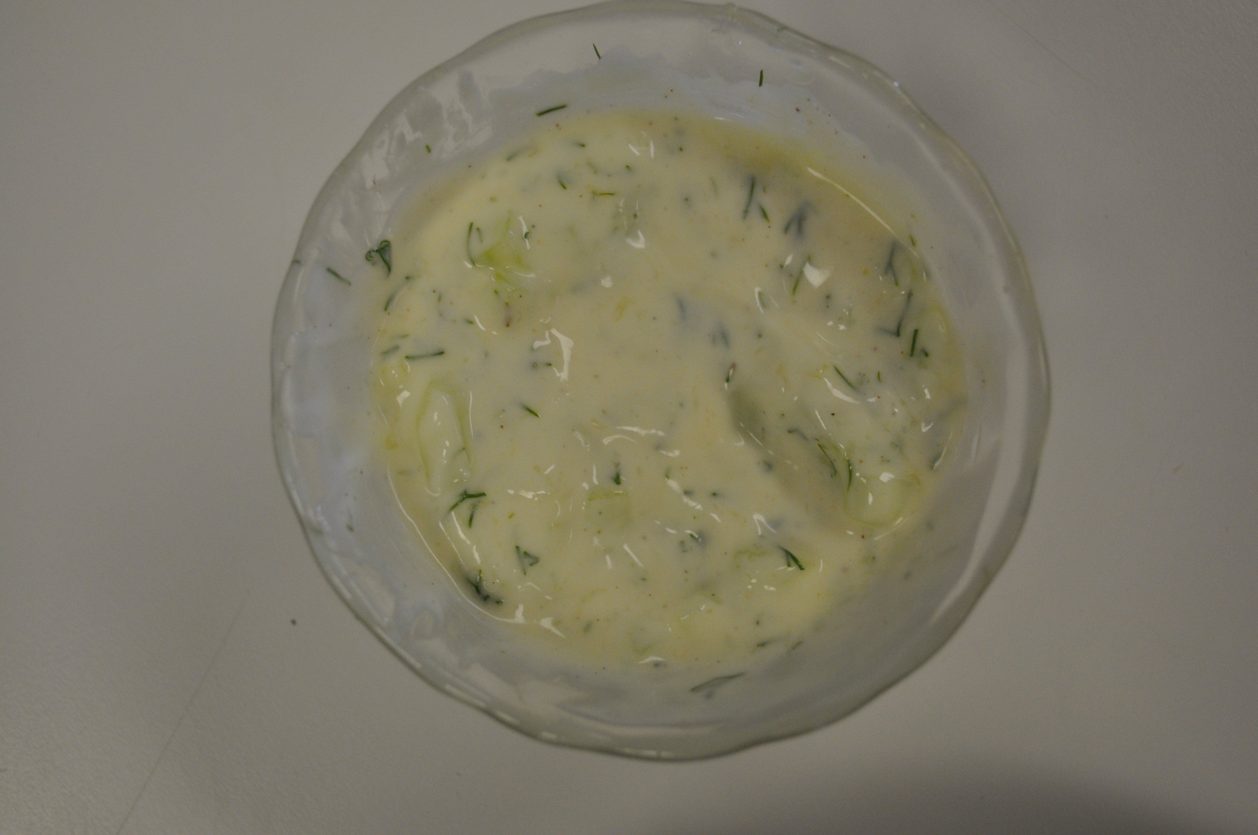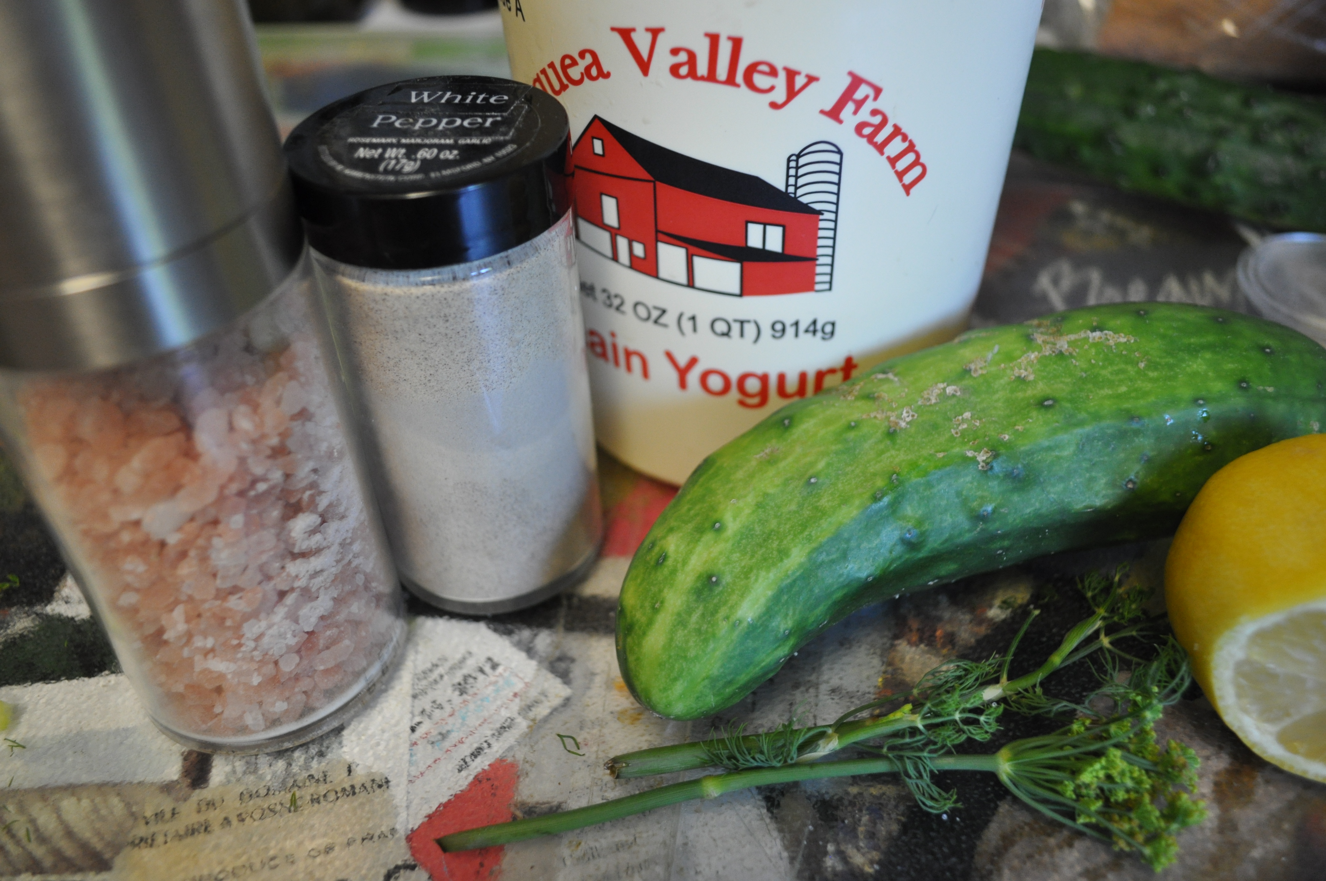 Tzatziki. A plop of plain yogurt. One diced cucumber. Teaspoon of fresh dill. Squeeze of lemon. Salt. Pepper.
