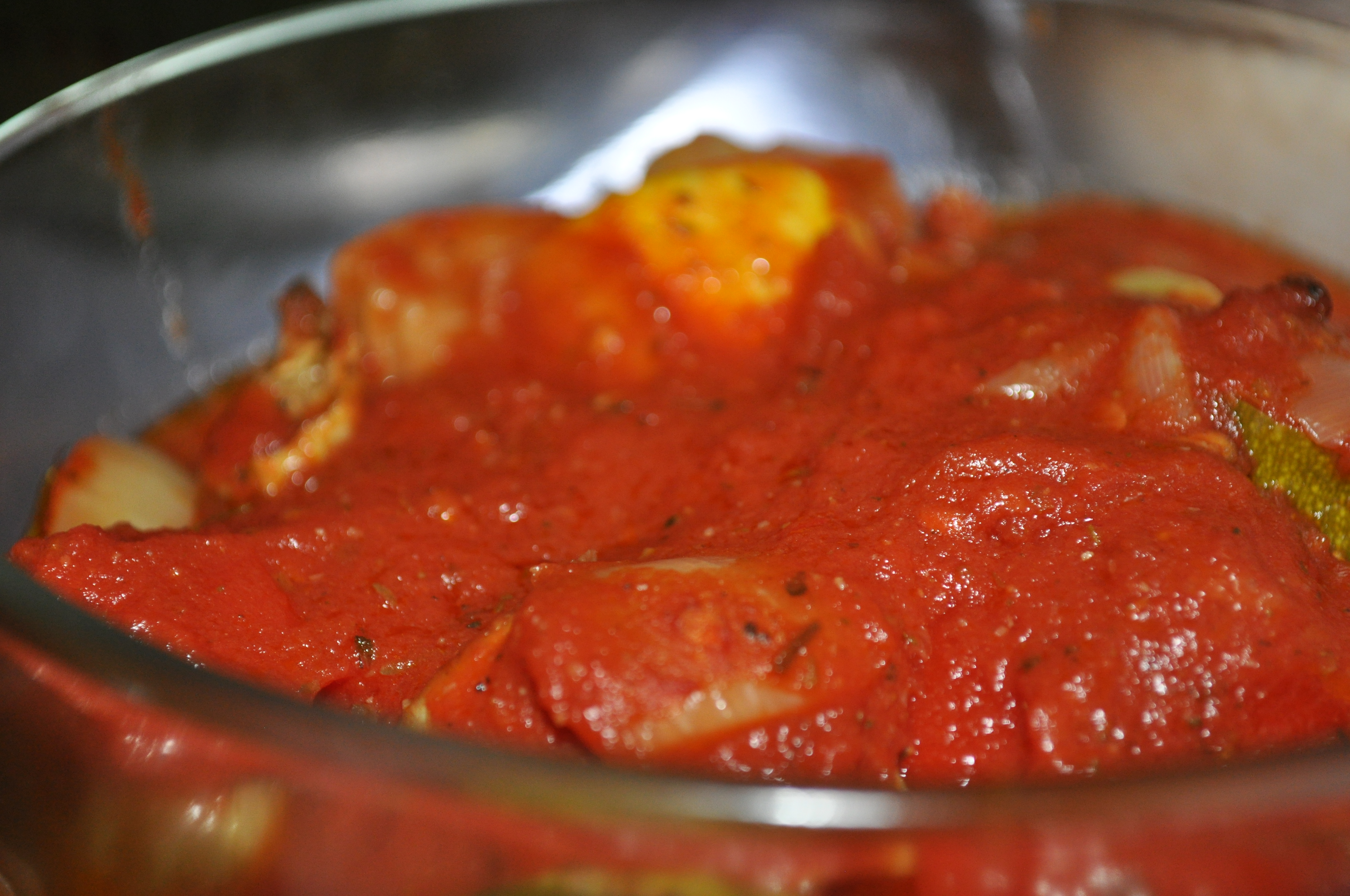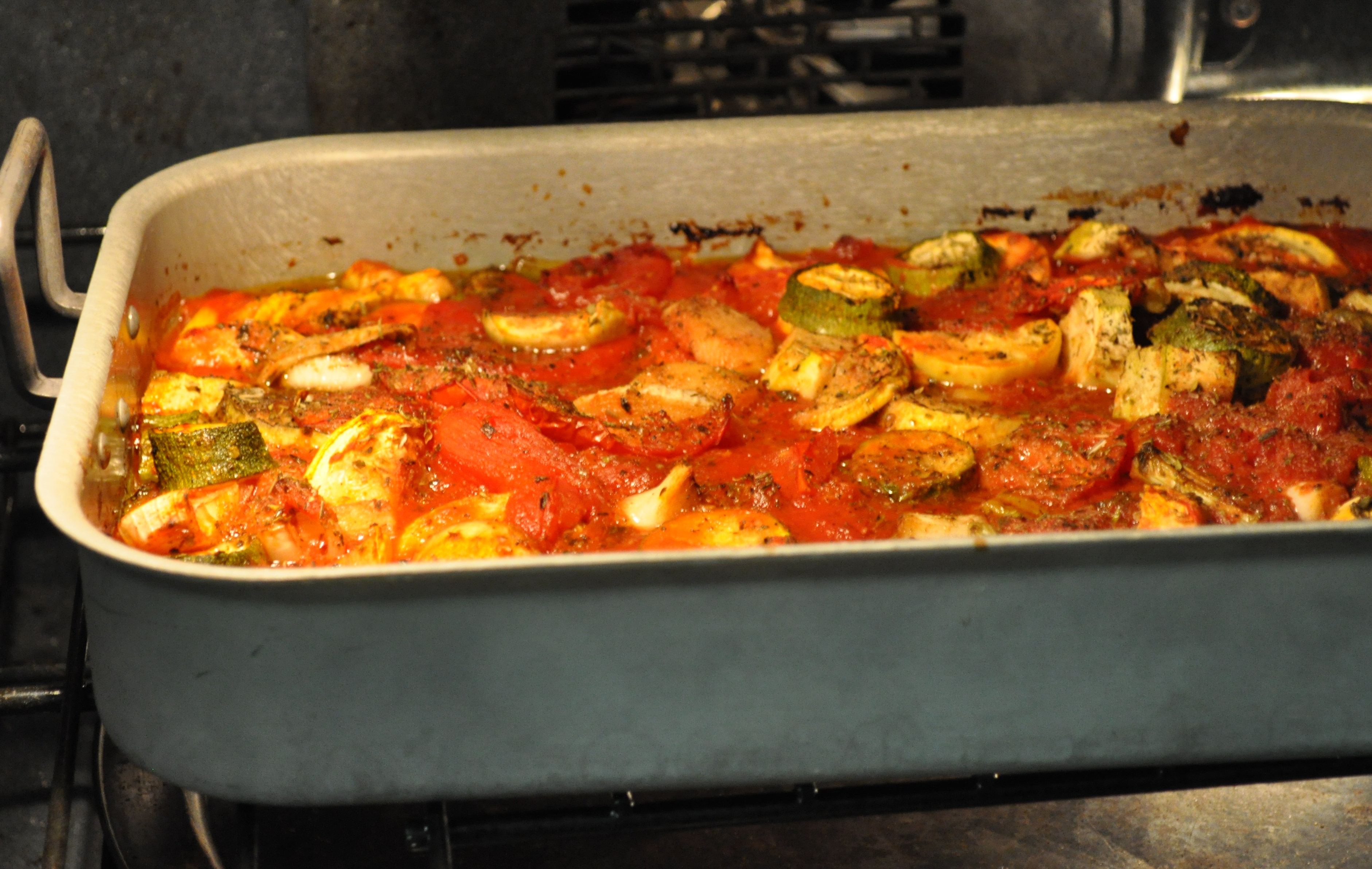 Pour all sorts of things into a baking pan. I used six small zucchini. Various types. Sliced. Added a 28 ounce can of San Marzano tomatoes. Peeled. Smashed up. A can of Roland roasted red peppers. Sliced onions. Italian herb mix. Salt. Pepper.