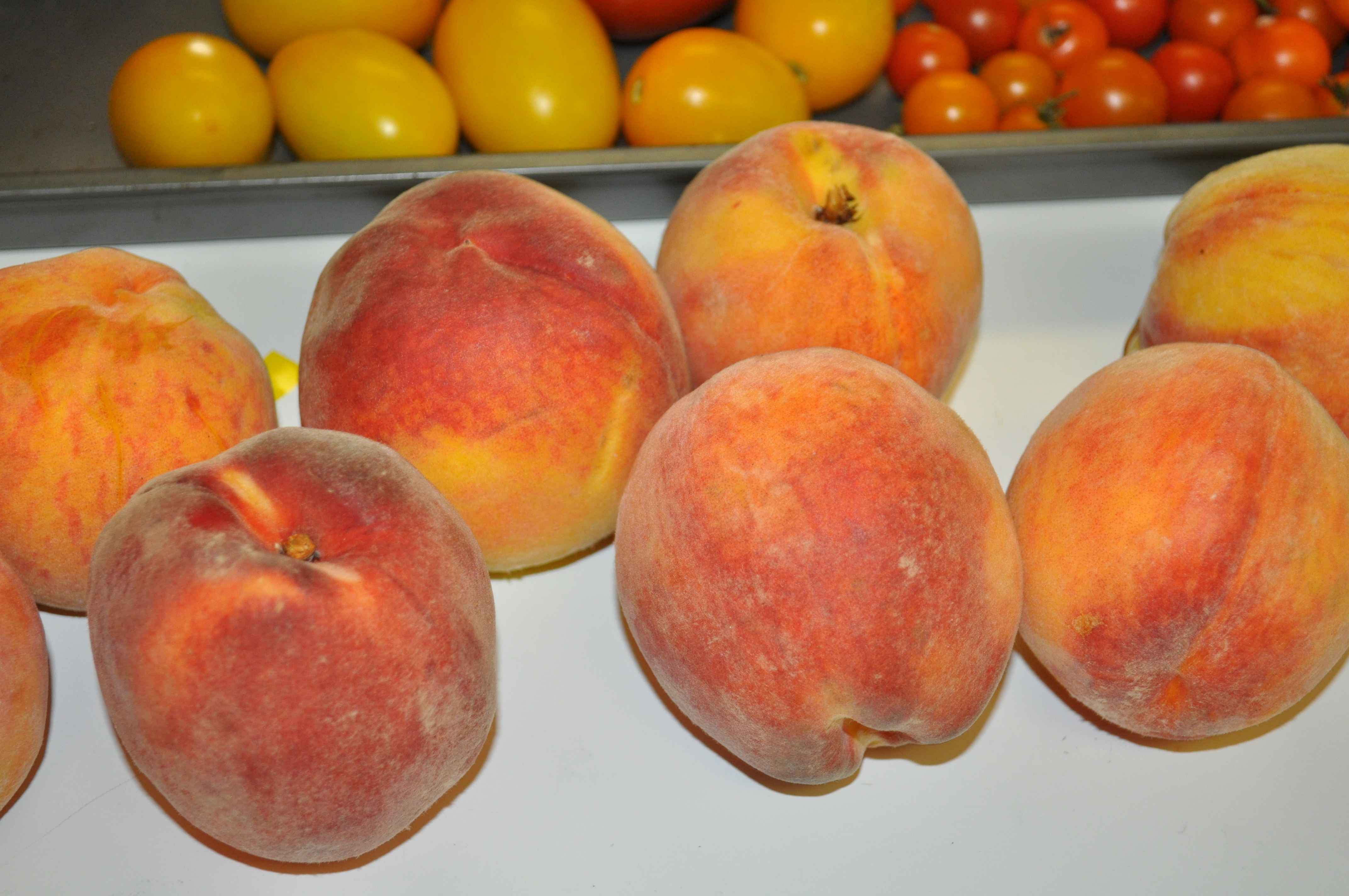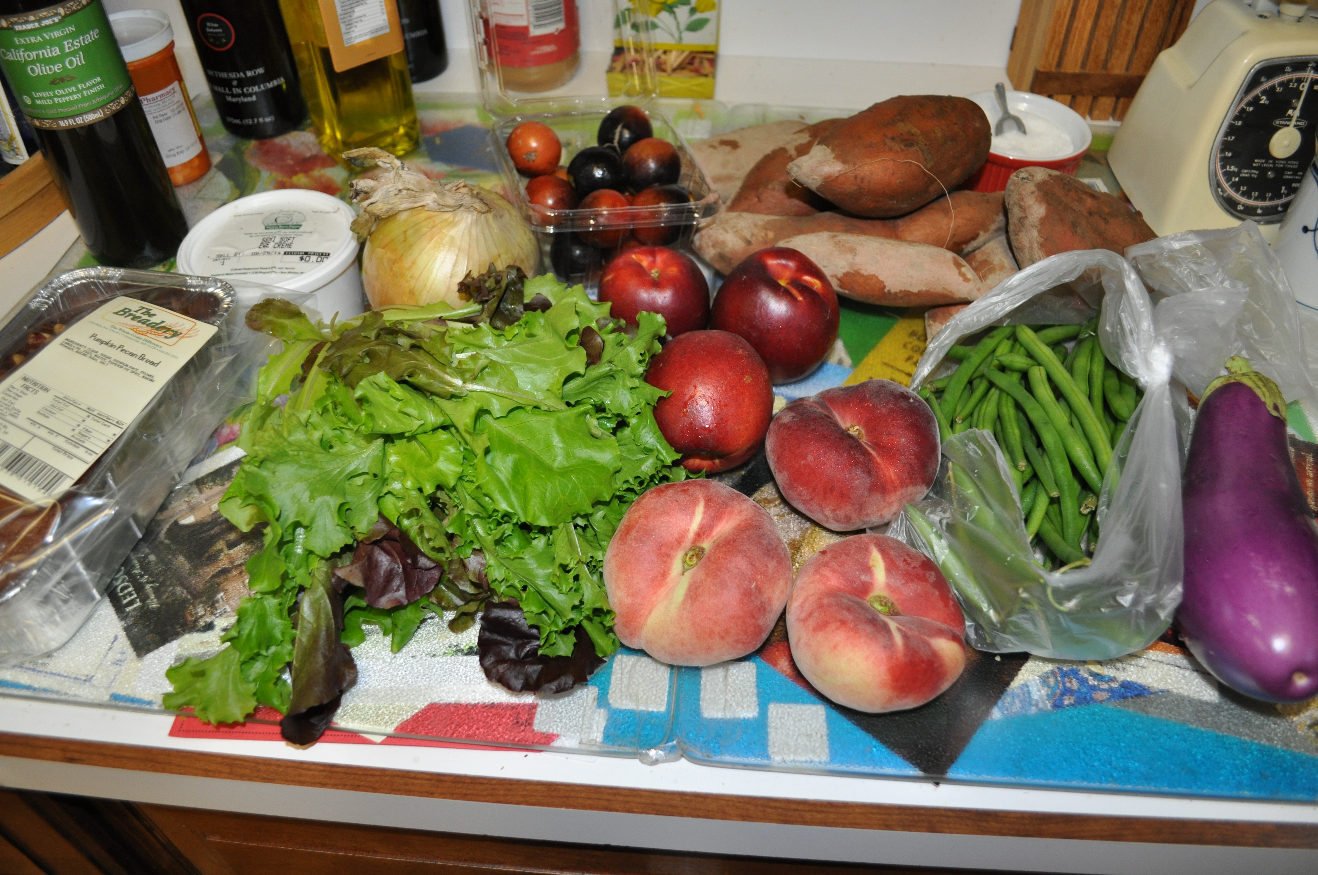 Spring Mix. Donut peaches. Nectarines. Sweet potatoes. Heirloom cherry tomatoes. A yellow onion. Green beans. An eggplant.