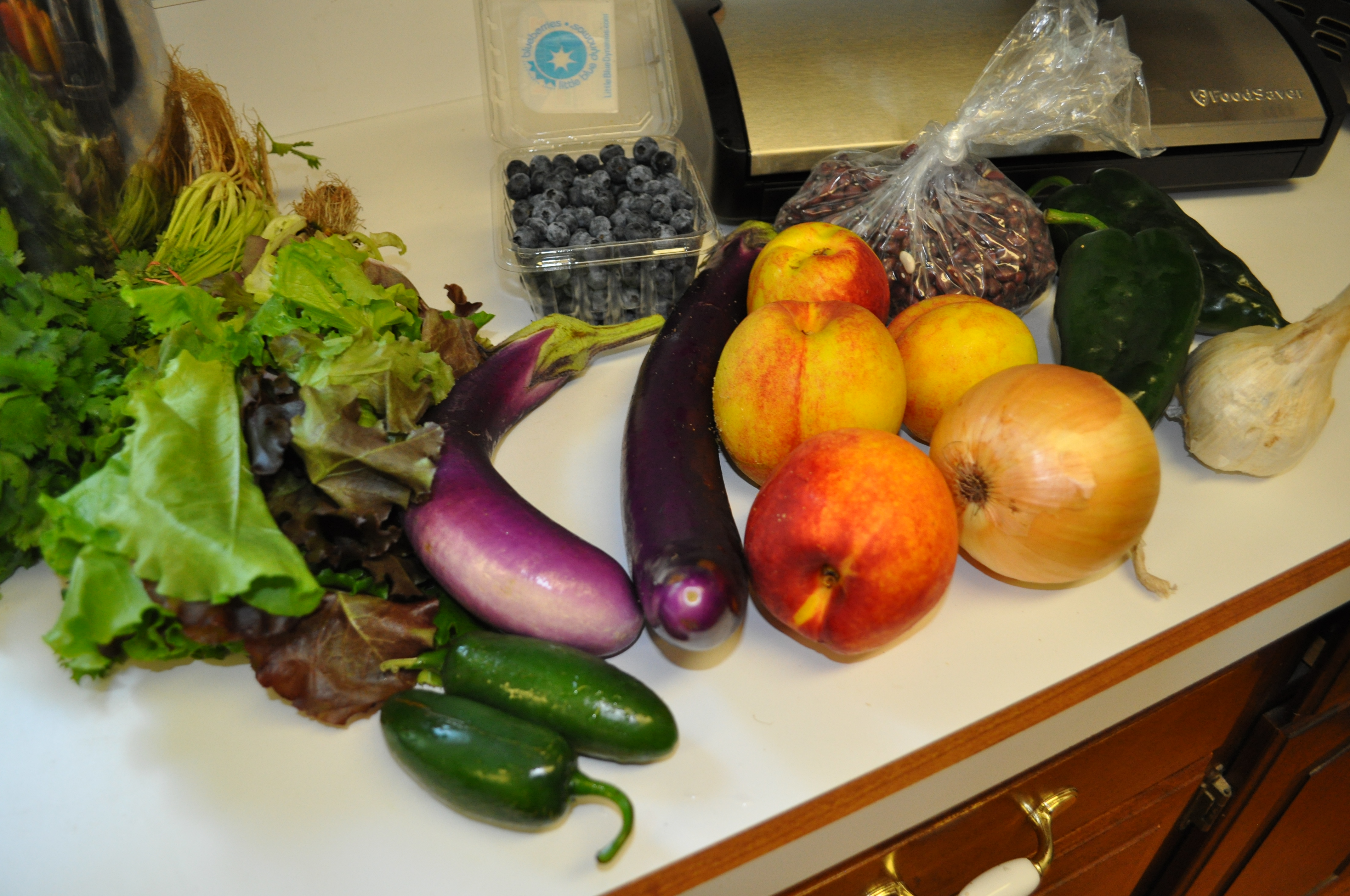 Cilantro. Lettuce. Eggplant. Blueberries. Nectarines. An onion. Elephant garlic. Poblanos. Jalapenos. Red Beans.