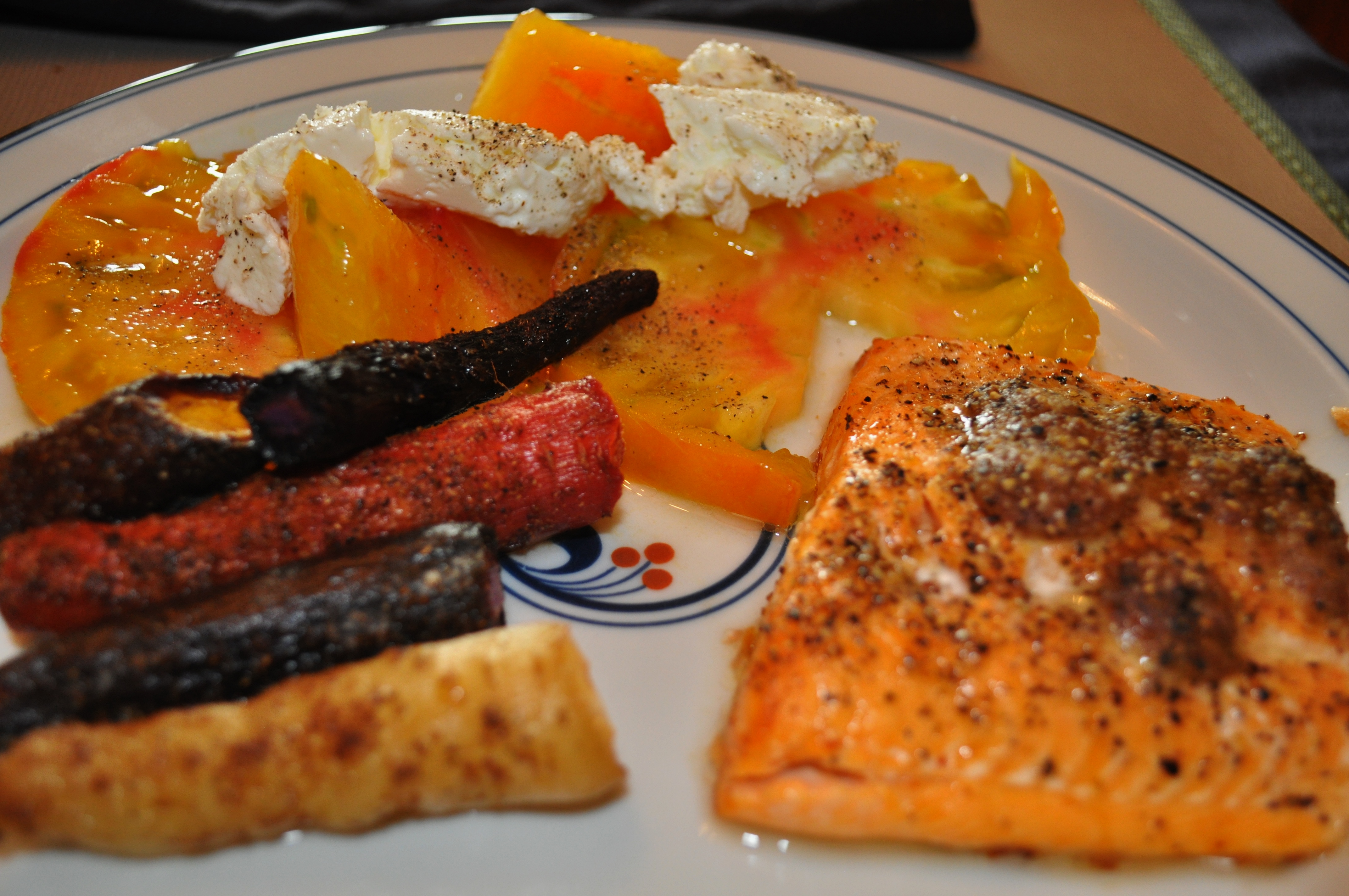 My pineapple tomatoes are finally kicking in there and producing. The heirloom carrots from last week’s CSA were oven roasted. The arctic char from this week’s Friends and Farms basket was quick baked at 400 degrees with some honey mustard and lemon pepper on top.