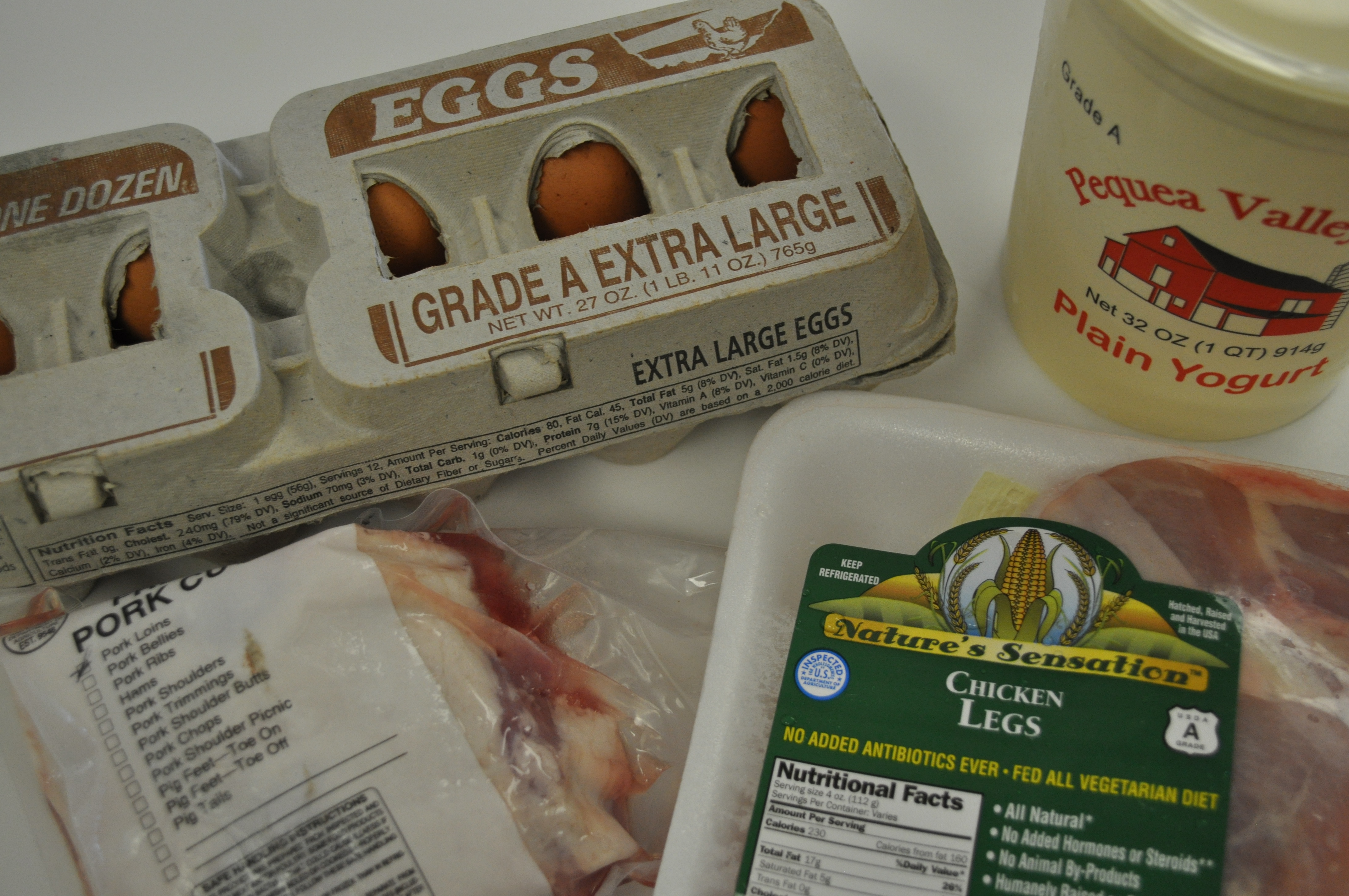 Chicken legs, eggs, yogurt and pork loin.