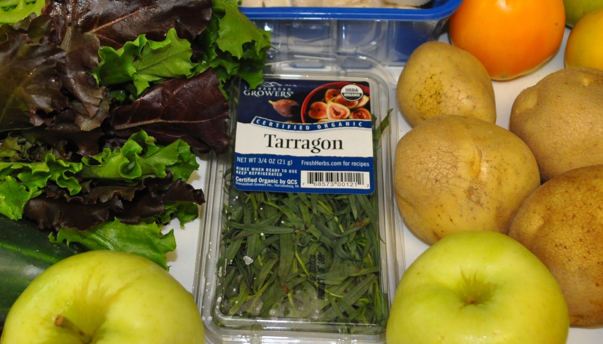 The tarragon and chicken inspired me to make soup. The pork loin and apples sound like a meal pairing to me. The yogurt and cucumbers made tzatziki tonight. Eggs went into an egg salad today.