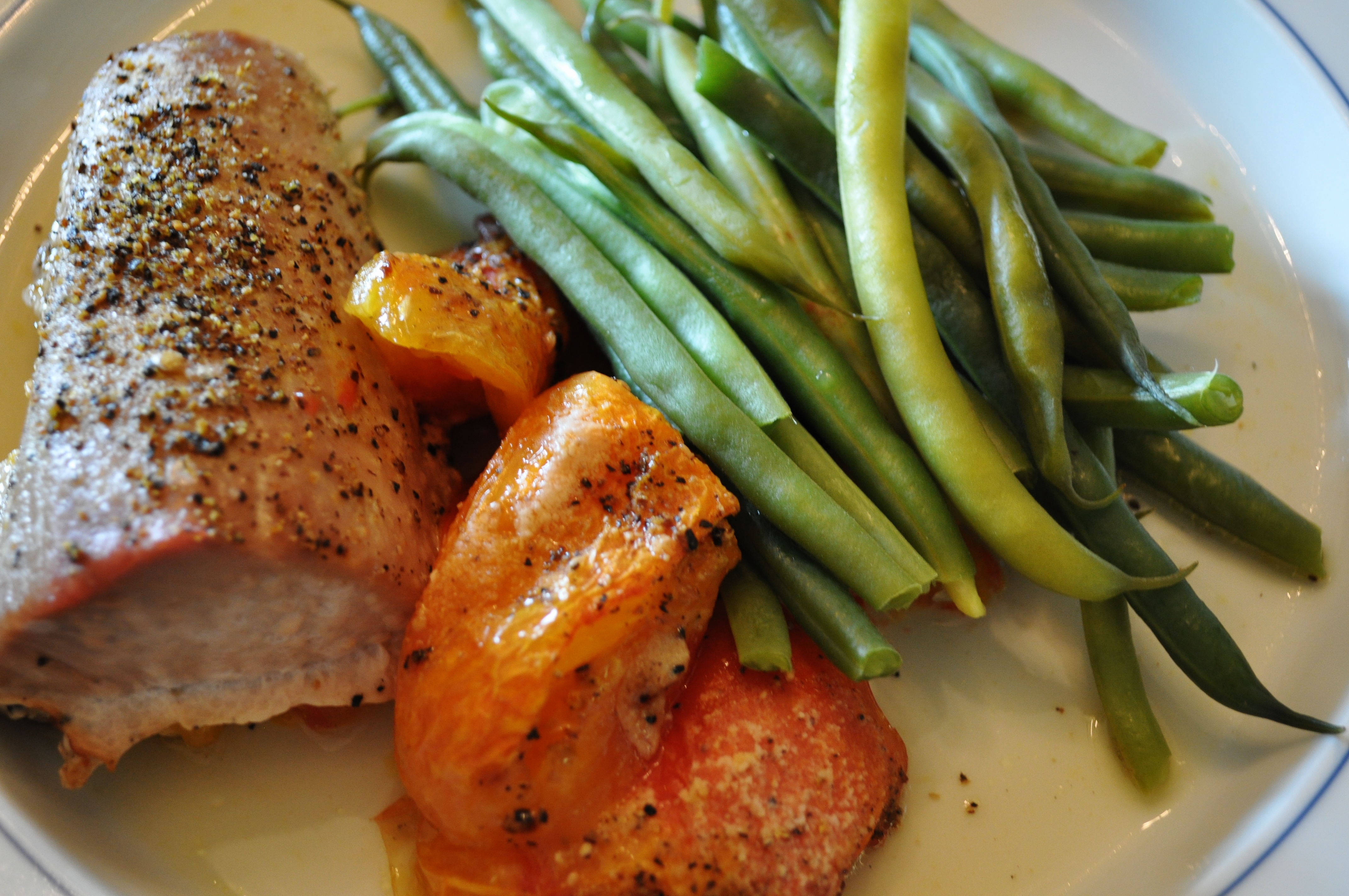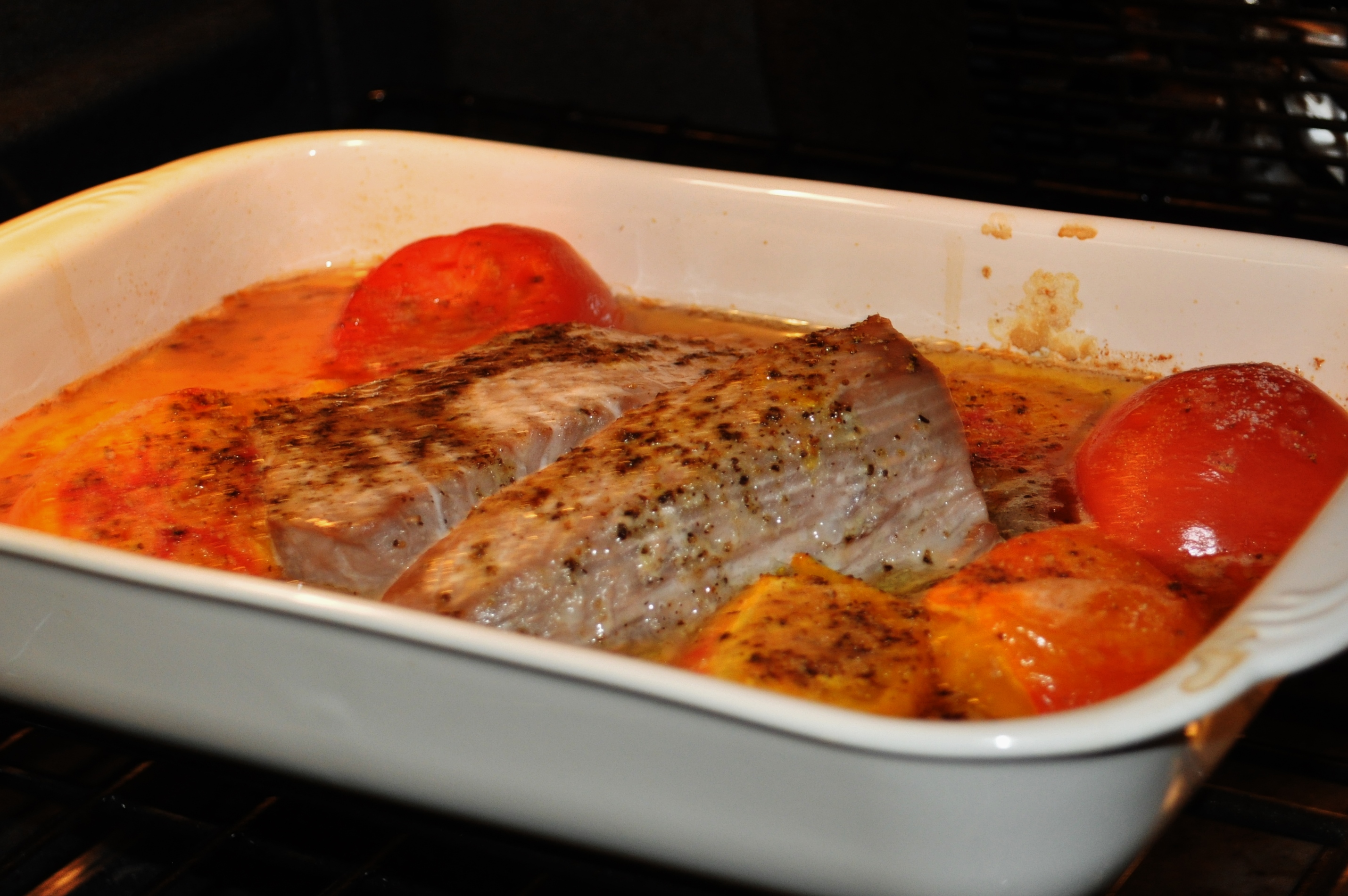 The tuna was slow cooked tonight with one of the tomatoes, and one of my heirloom pineapple tomatoes. Covered with lemon zest, olive oil, white wine vinegar and herbs.