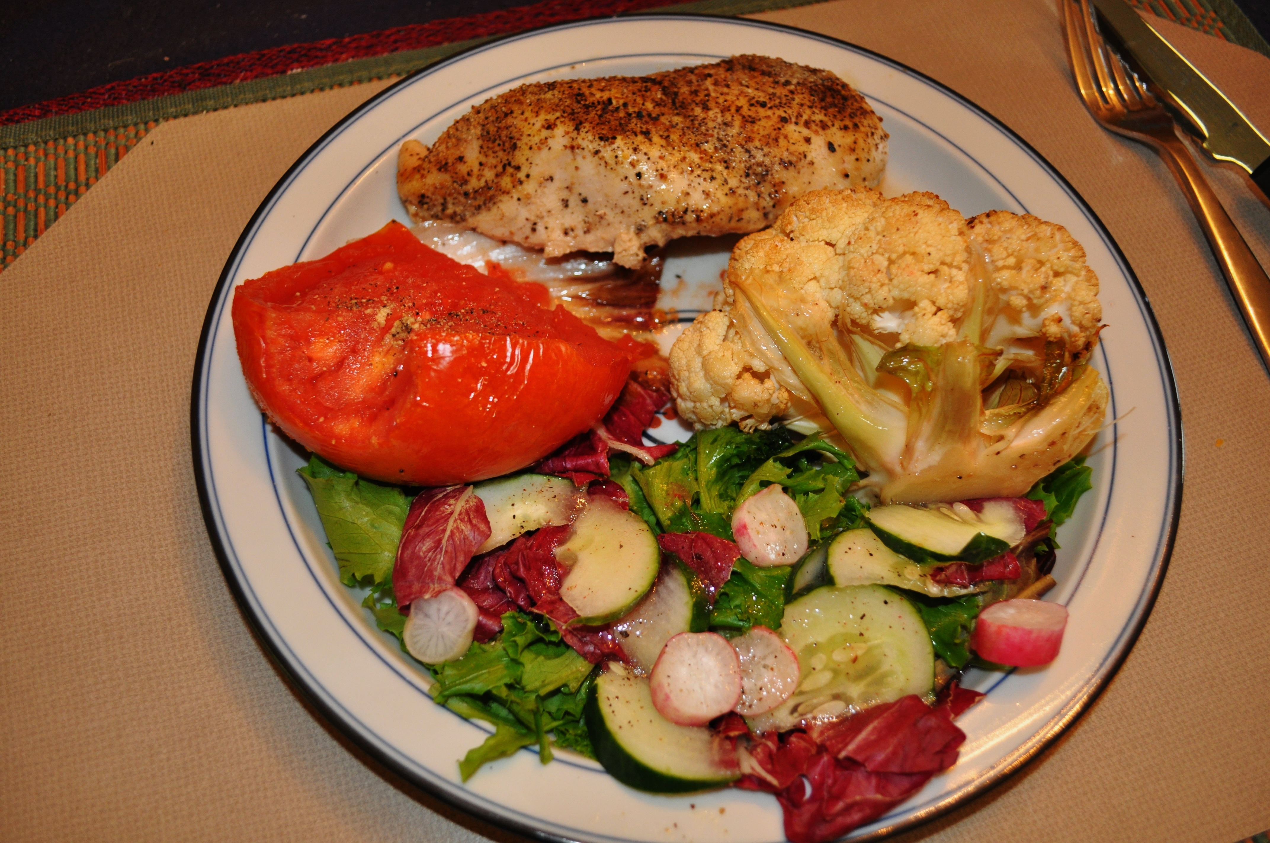 Tonight I baked, in the same large pan, the Bell and Evans chicken breasts. Two for dinner tonight. One for my husband to take for a dinner while radio contesting this weekend. Last week’s cauliflower. Covered with olive oil, white balsamic, garam masala and salt. Last week’s tomato. Split open and filled with Italian dressing. A side salad from hydroponic lettuce, cucumber and radish. That meant I used up the last of the veggies from a week ago, and I am ready to take on this week’s.